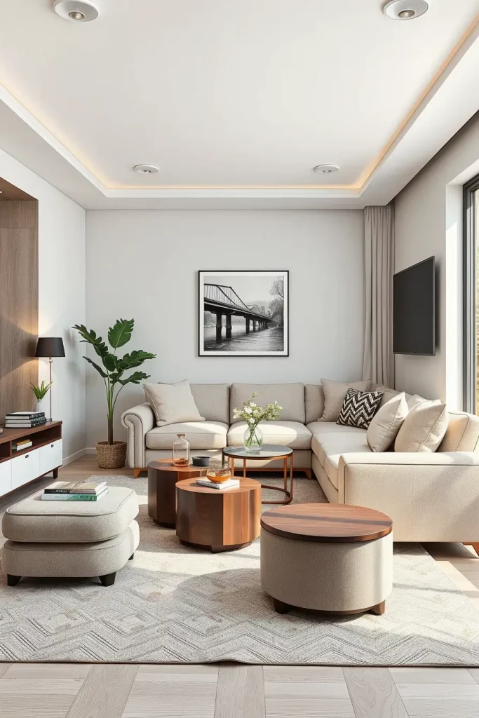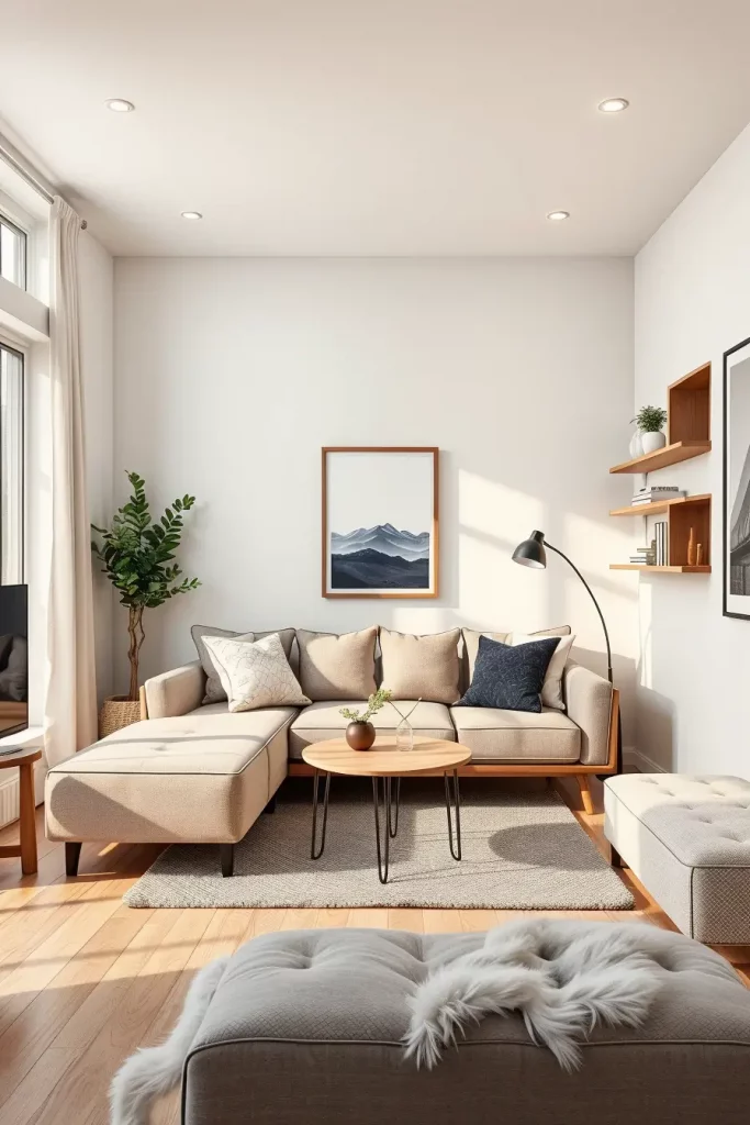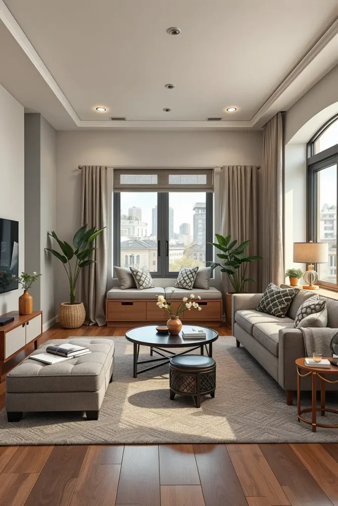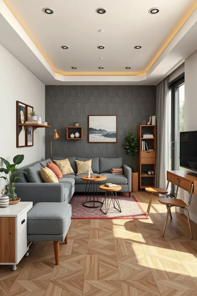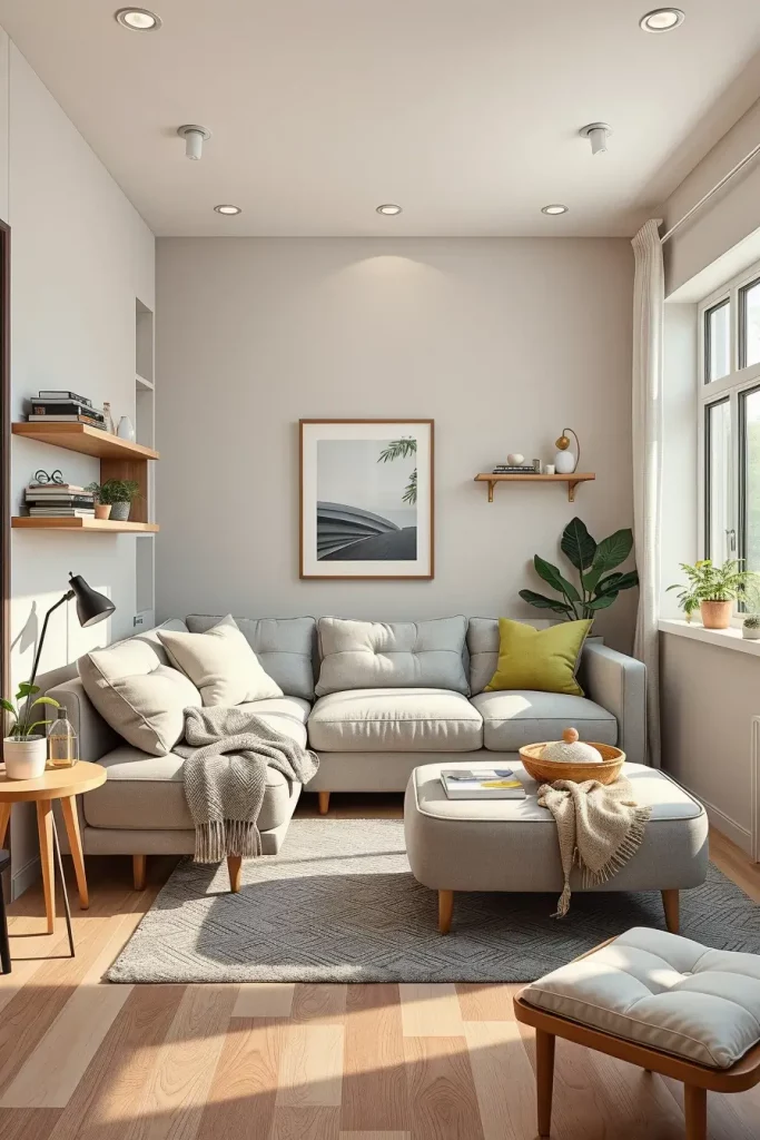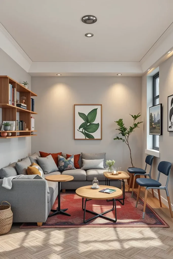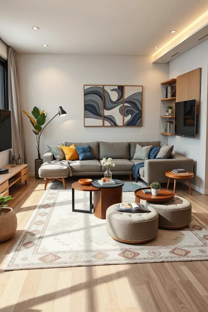 I frequently choose small sofas, nesting coffee tables, and ottomans that store something. Slim media stands or wall-mounted shelves ensure that the space is not cluttered. A small rug does not overpower the floor as it defines the seating area.
