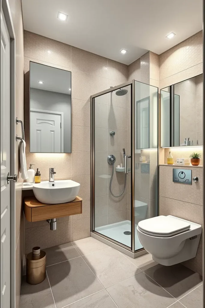 I suggest the use of slim vertical cabinets, open shelves above the toilet and use of sliding shower doors to free up some valuable floor space. Every single object contributes to maximizing space- mirrors increase light, and floating vanities allow the floor to be seen, which creates the effect of openness.
