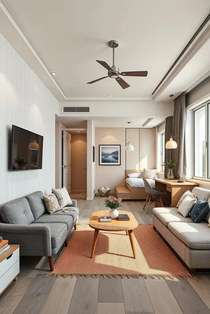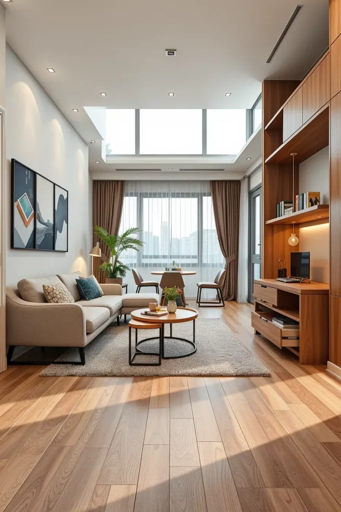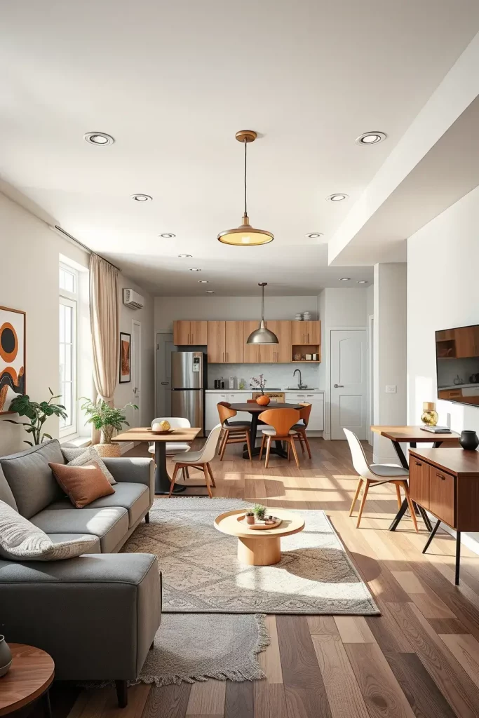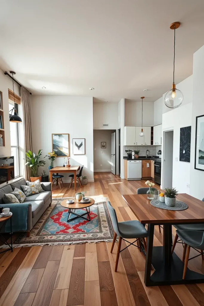 I tend to suggest the use of rugs and lighting to delineate each area without the use of walls. As an illustration, there is a clear distinction between the living area by a soft area rug beneath the sofa, and the section of the room with the pendant lighting above the dining table. Multi-purpose furniture like extendable dining tables or wall-mounted desks are also slim, which contributes to keeping the layout uncluttered and versatile.