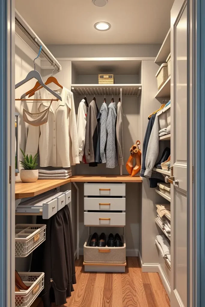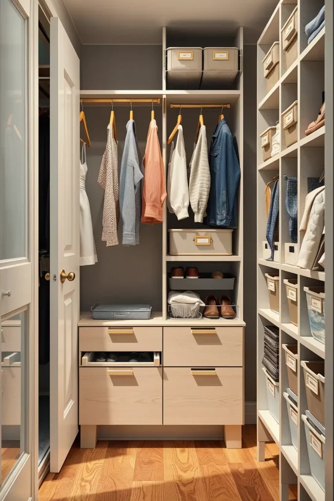 Such essentials as slim velvet hangers, drawer dividers, and tiered shoe racks are needed. I would also suggest door-mounted organizers to accessories or even seasonal storage bins. Every composition maximizes the small cubic space.