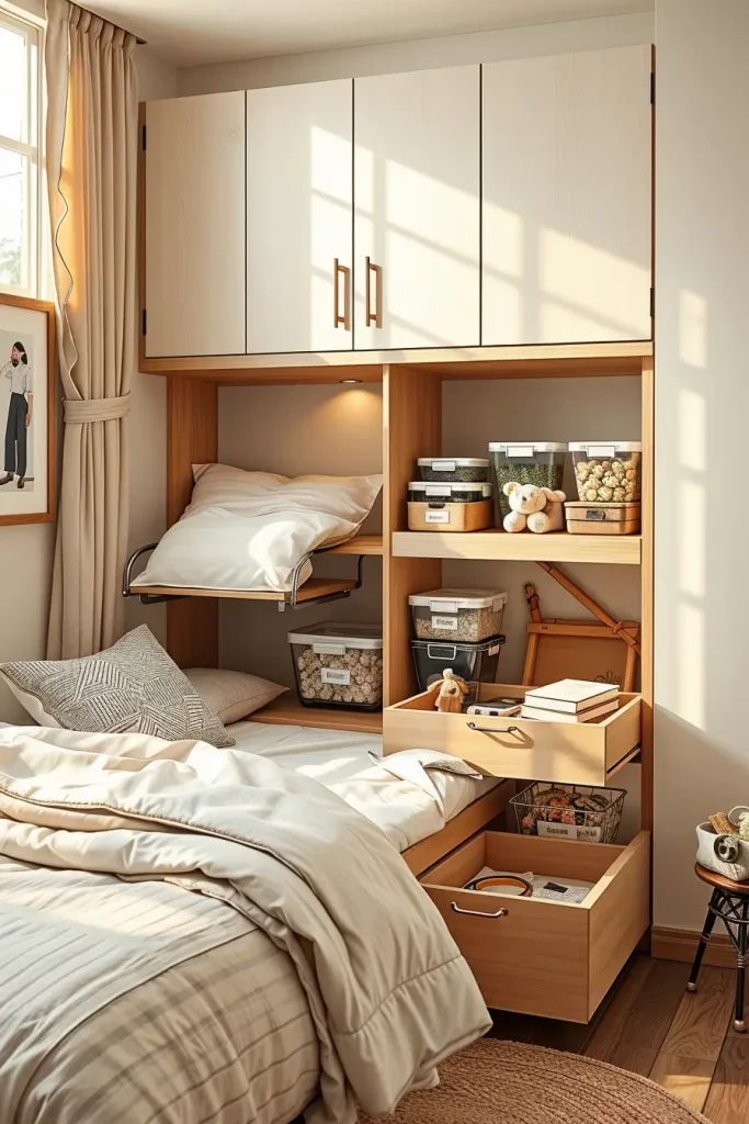 I suggest purchasing beds with inbuilt drawers or purchasing under-bed organizers that have wheels. It is easy to see what is inside the clear bins and the fabric bins keep things tidy and dust free.