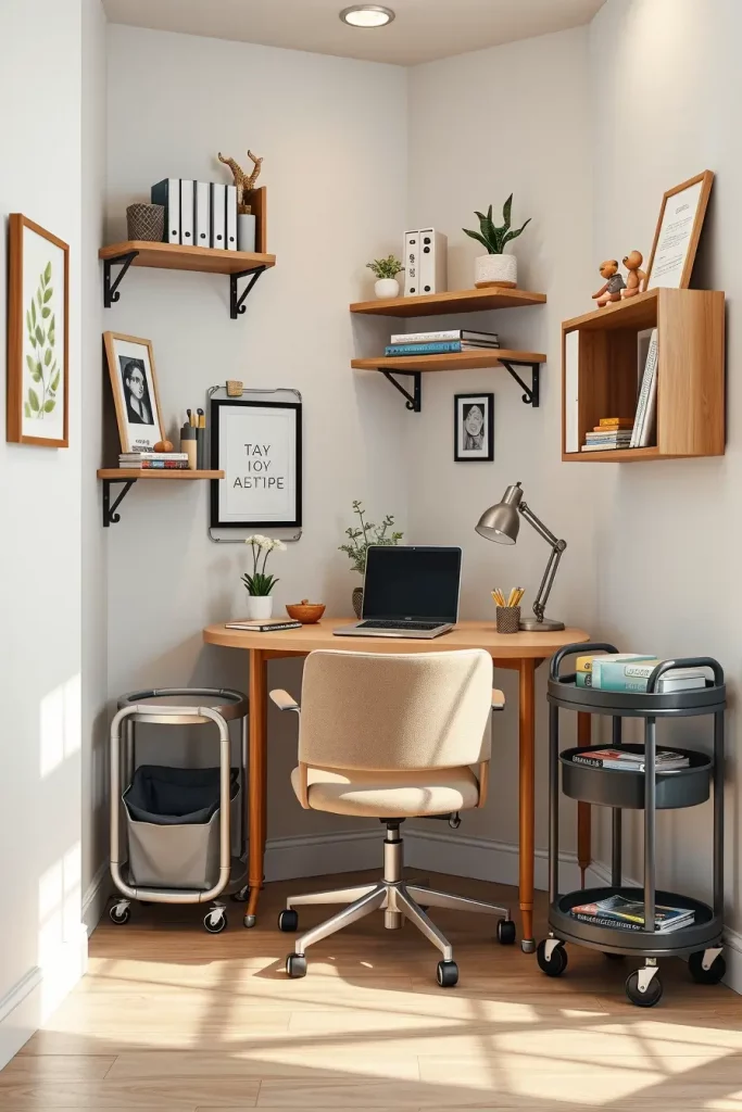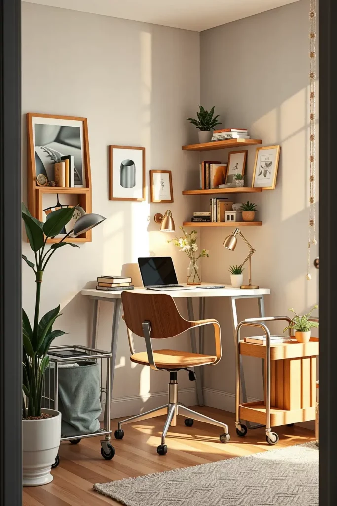 An example is a workstation can be a narrow desk or even a console table against the wall. Shelving mounted on the wall above the desk gives space to books, files and decoration and a comfortable yet slim chair makes things practical. Another excellent addition is a small rolling cart that is flexible to store.