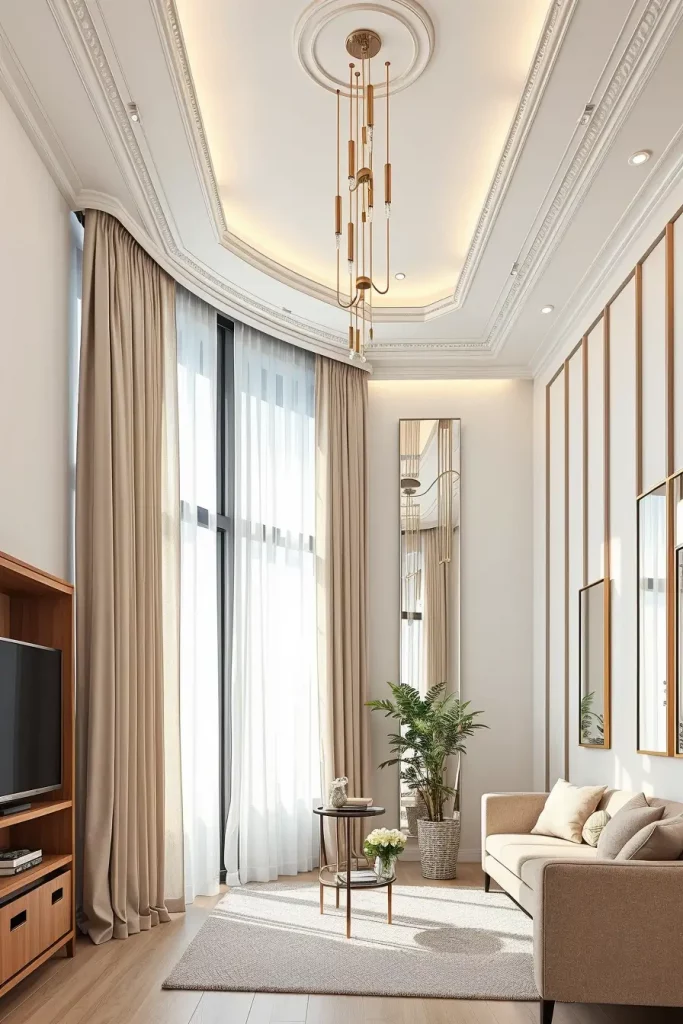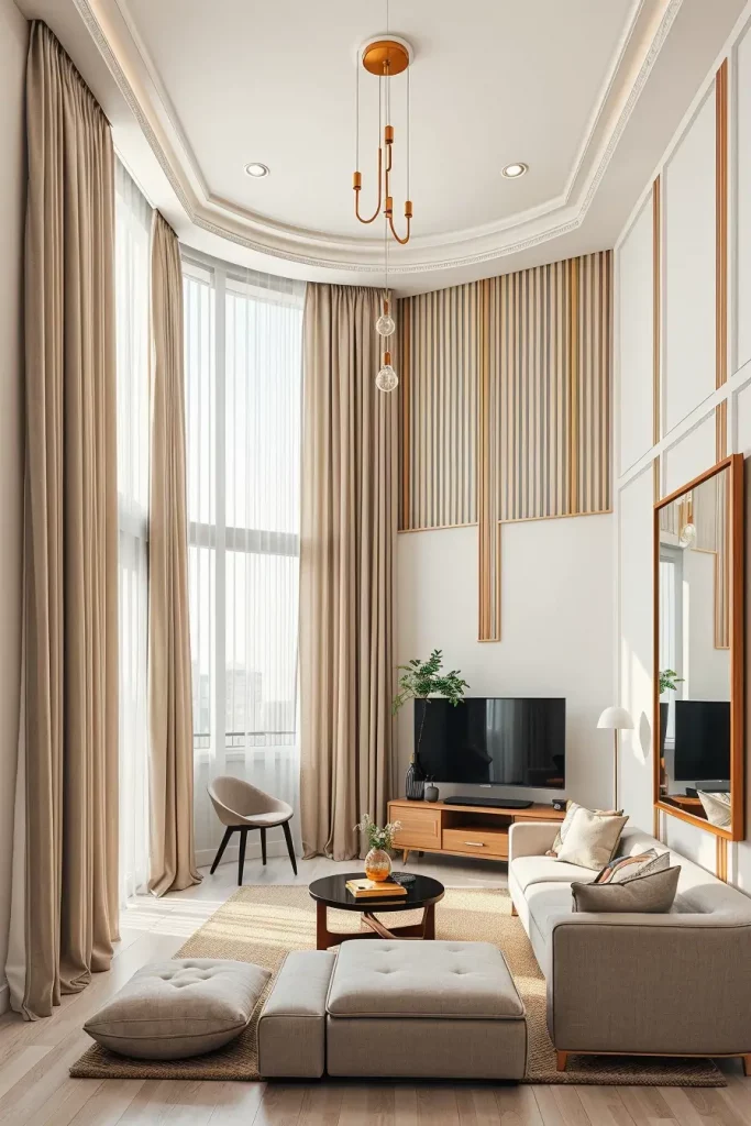 Low ceilings may shrink a room to a smaller size than it is, but with a few interior design tricks, I have learned how to give the impression of a higher ceiling. Vertical design features play an important role: tall curtains are placed near the ceiling, the wall is drawn in vertical stripes, and narrow bookcases all contribute to moving the eye upwards. The impact is direct – the room is taller, airier and more spacious.