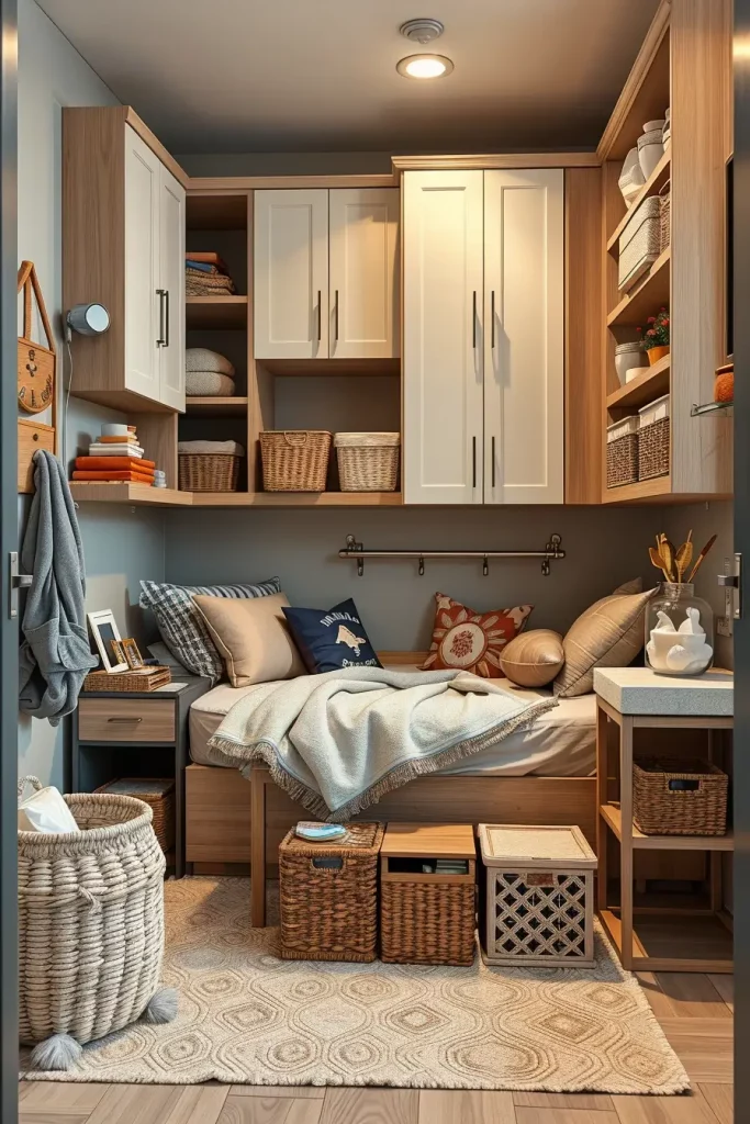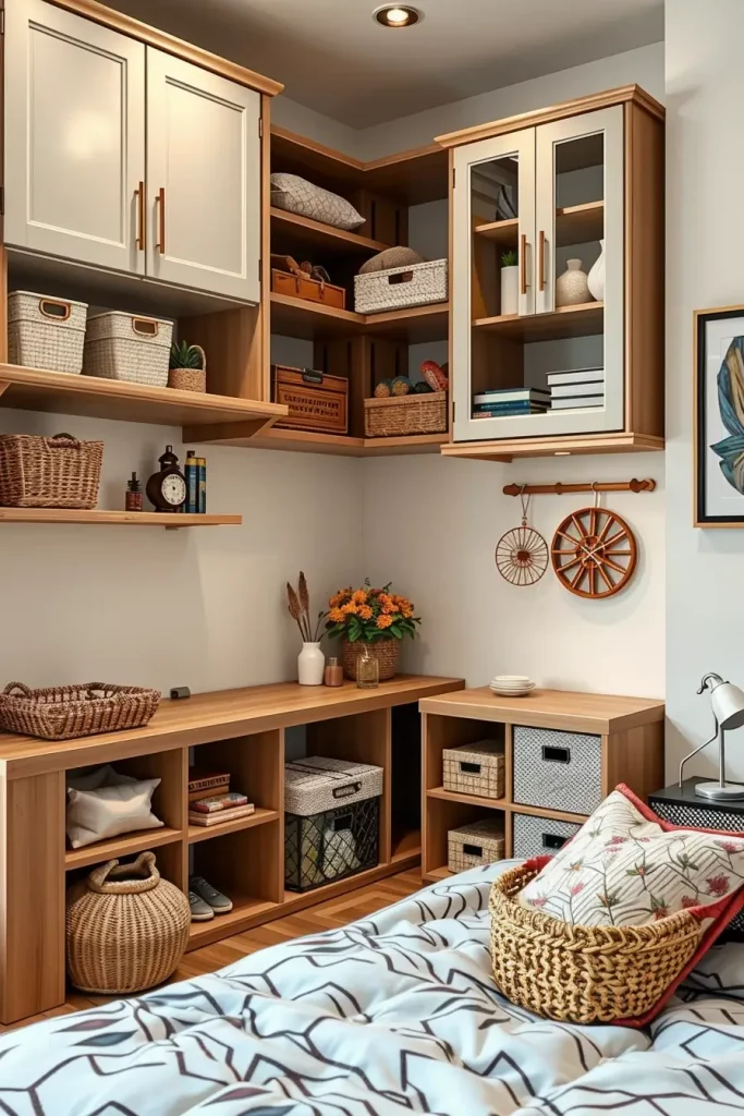 I frequently employ wall-mounted cabinets, under-bed bins, and furniture with inbuilt spaces. Ornamental baskets and stackable storage boxes are also a great addition, as they give easy organization and also match the decoration.