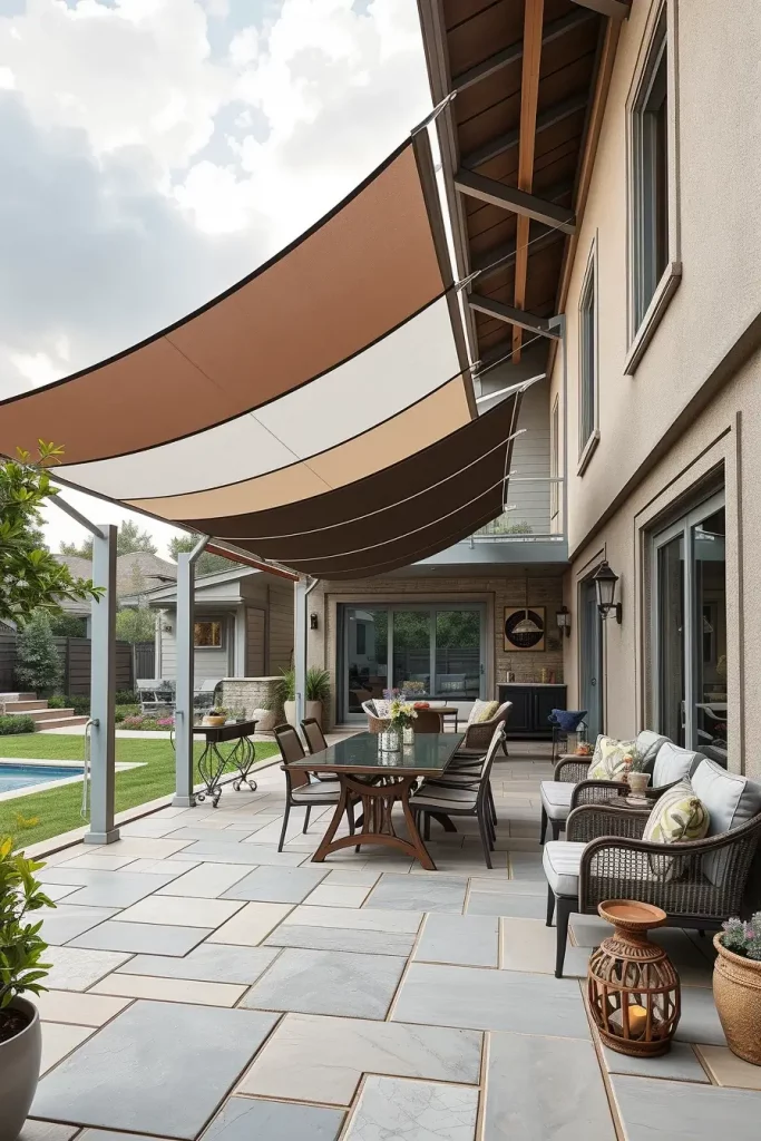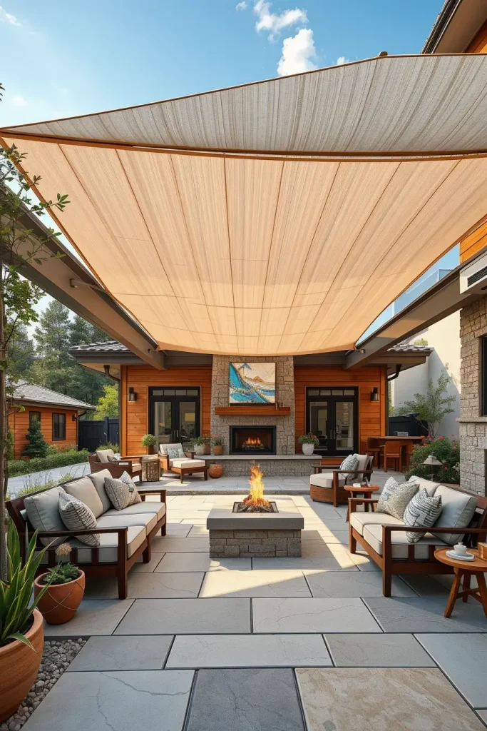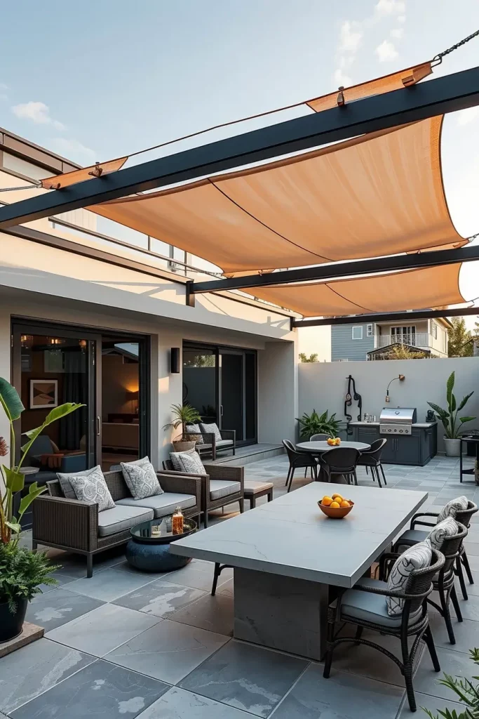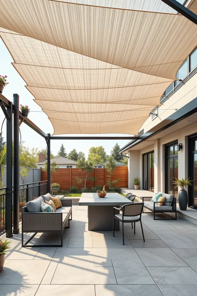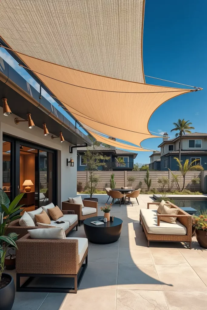 I typically pair shade sails with streamlined outdoor seating, such as modular sectionals, minimalist dining sets, and sculptural lounge chairs. Stainless steel posts or wall-mounted anchors support the sails, while durable fabric in neutral or earthy tones complements stone flooring and modern landscaping. This combination keeps the patio visually light yet highly functional.