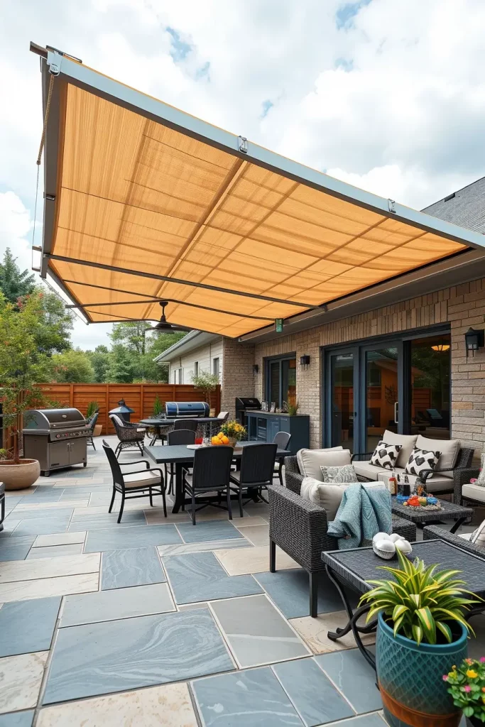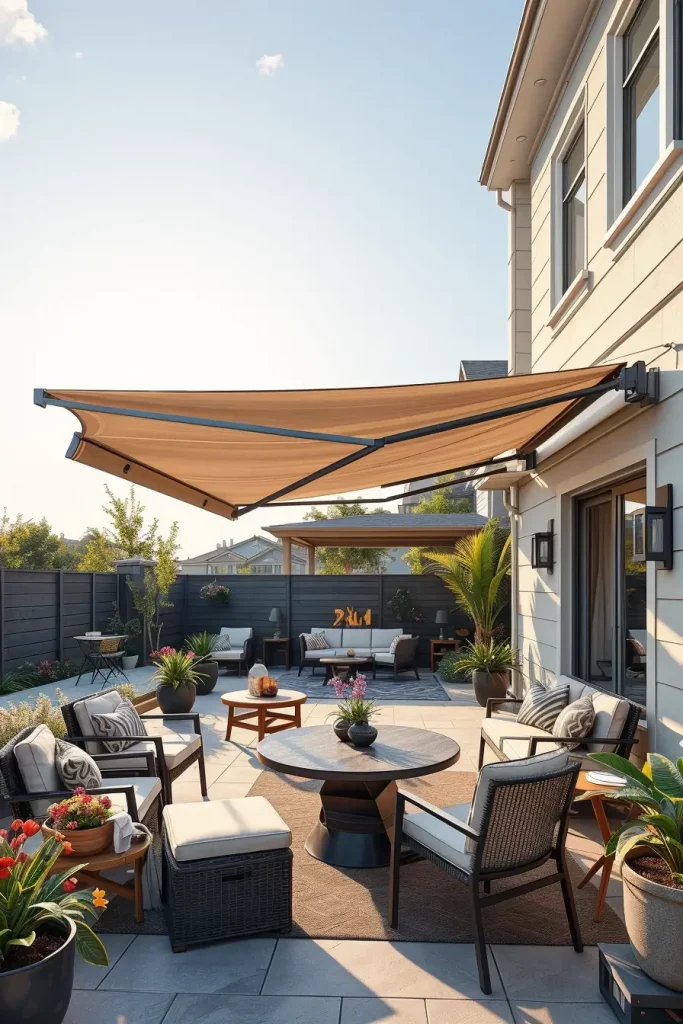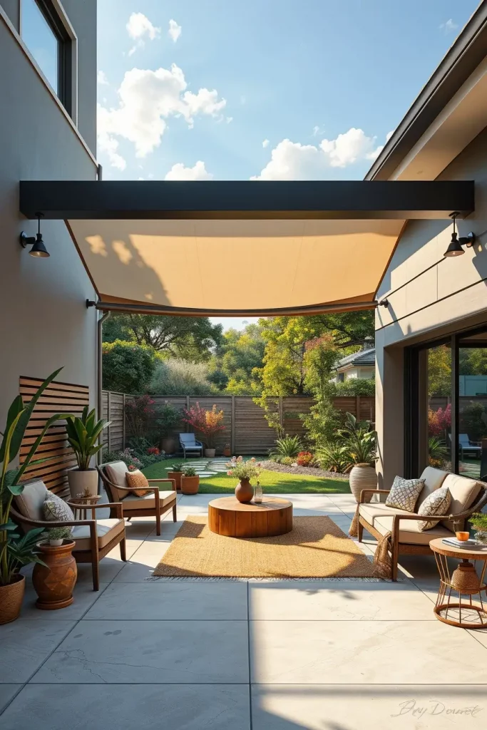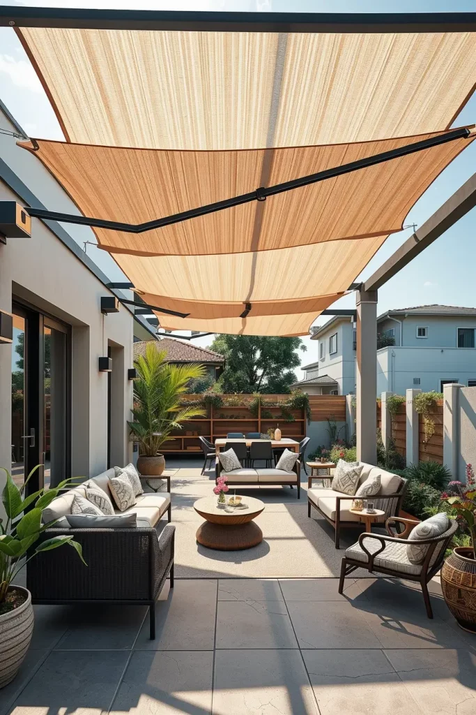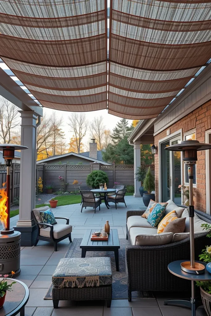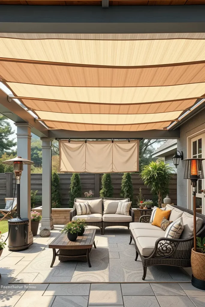 I frequently use retractable awnings, removable fabric panels, and pergola systems with adjustable louvers. These pair well with weather-resistant sofas, outdoor heaters, and layered textiles, allowing the patio to transition smoothly from hot summer days to cooler evenings.