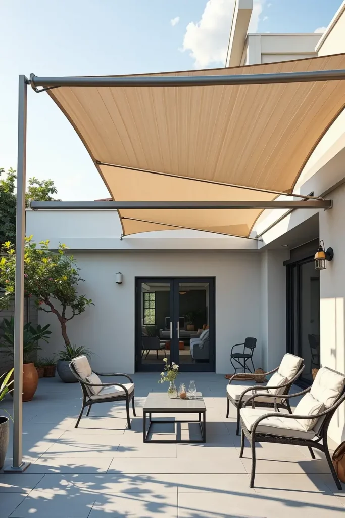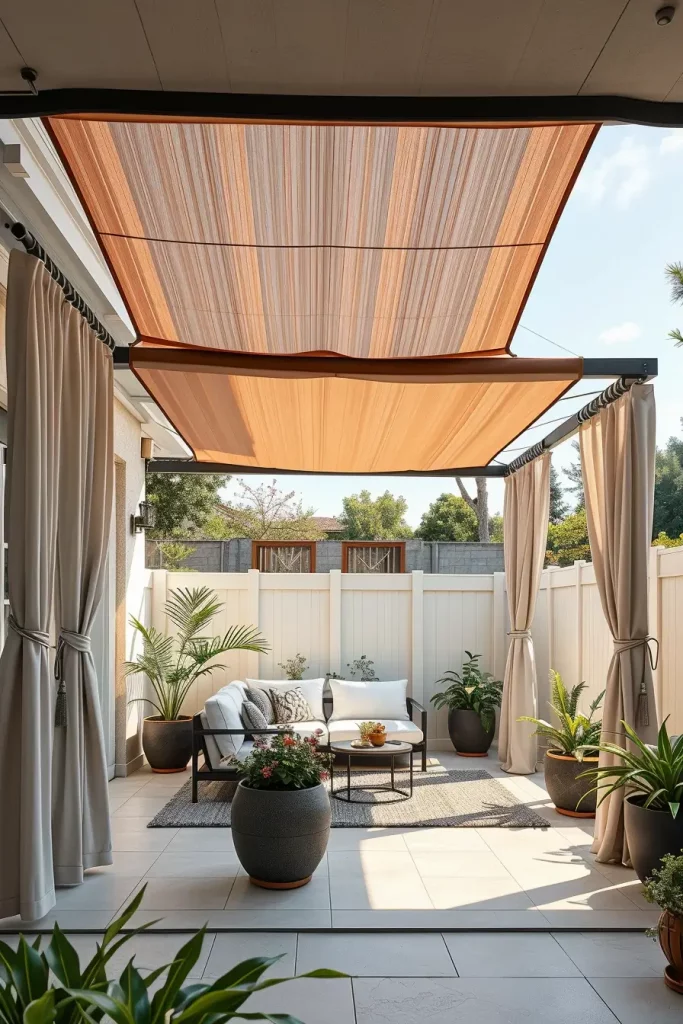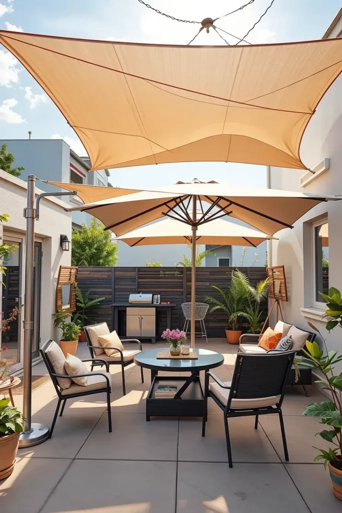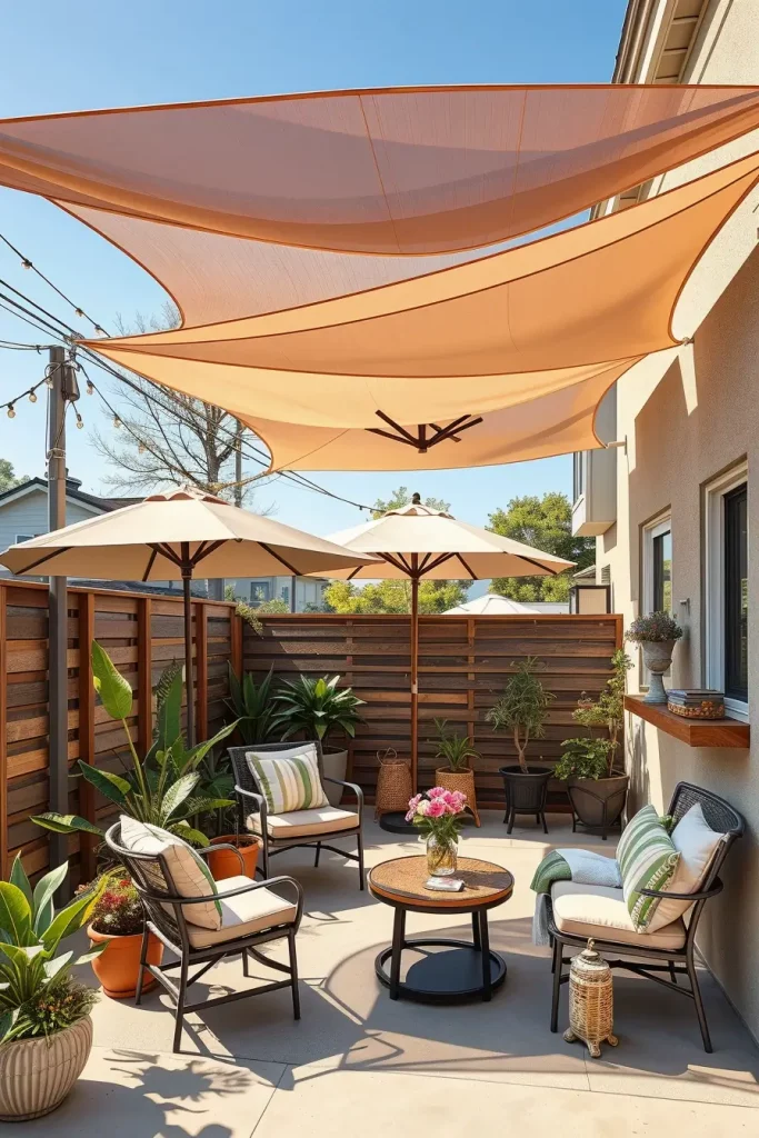 I often recommend fabric shade sails, freestanding umbrellas, or DIY curtain systems mounted on existing structures. These options work well with compact outdoor furniture, folding chairs, and lightweight tables, allowing flexibility without major investment.