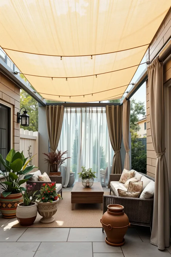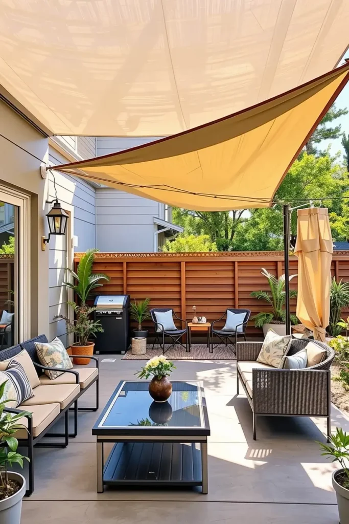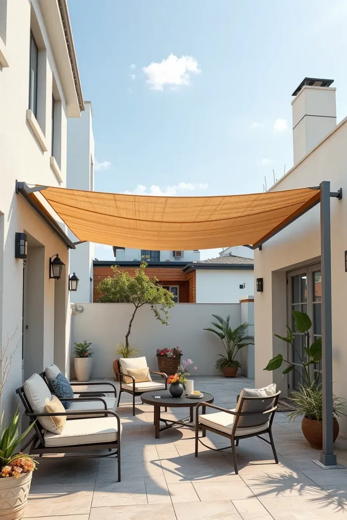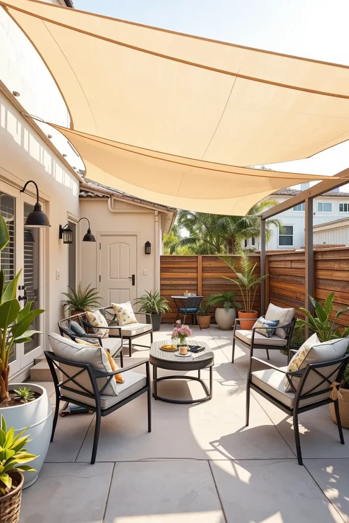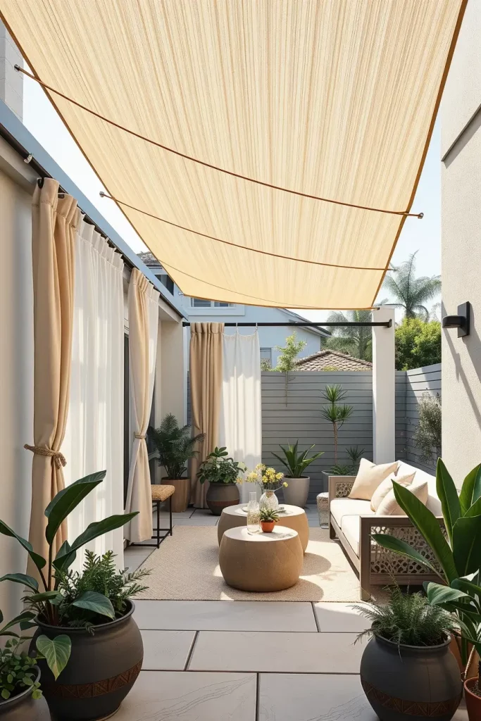 I often recommend fabric shade sails, freestanding umbrellas, or DIY curtain systems mounted on existing structures. These options work well with compact outdoor furniture, folding chairs, and lightweight tables, allowing flexibility without major investment.