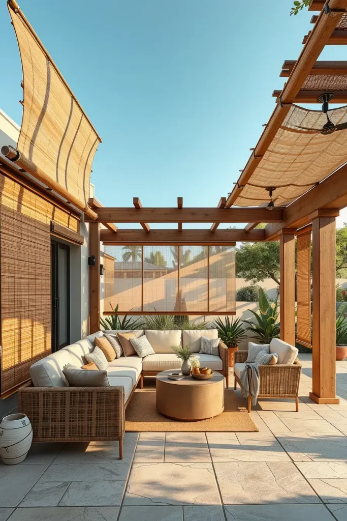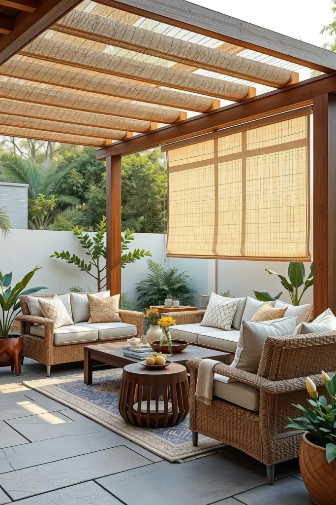 From a design perspective, bamboo roll-up shades, woven reed panels, and natural fiber canopies work best when paired with wood or stone patios. I usually integrate them with low-profile wooden pergolas, neutral outdoor sofas, and stone or concrete flooring to maintain balance. These materials age gracefully and add depth without overwhelming the patio design.