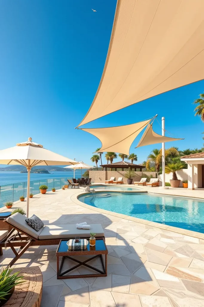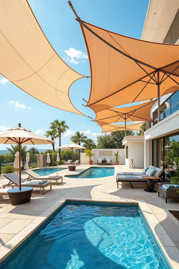 I often use cantilever umbrellas, sail shades, or pergola-mounted panels positioned near chaise lounges and outdoor sectionals. Materials must be moisture-resistant, and I prefer light-colored fabrics that reflect heat while complementing water tones and stone decking.