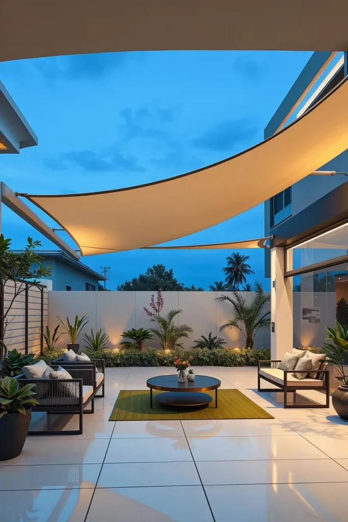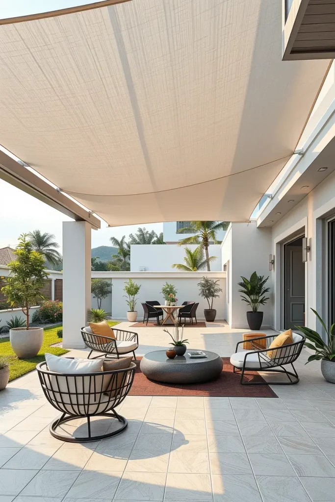 For patios exposed to intense sunlight, UV-blocking sun shades are essential in my designs. These shades help reduce glare, lower surface temperatures, and protect both people and furnishings from sun damage. I treat them as a core element rather than an accessory, integrating them early in the planning phase.