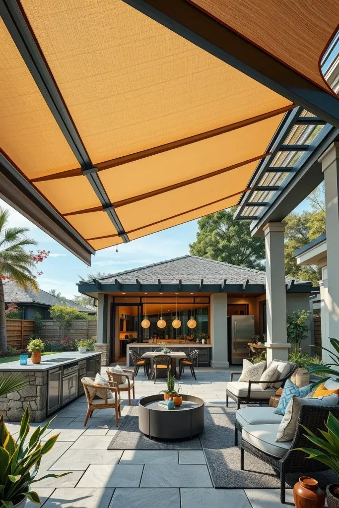 I typically pair extended shade sails or pergola-mounted fabric panels with large dining tables, weather-resistant chairs, and outdoor kitchen islands. Heat-resistant fabrics and water-repellent materials are essential here, especially when the space includes grills, sinks, or prep counters.
