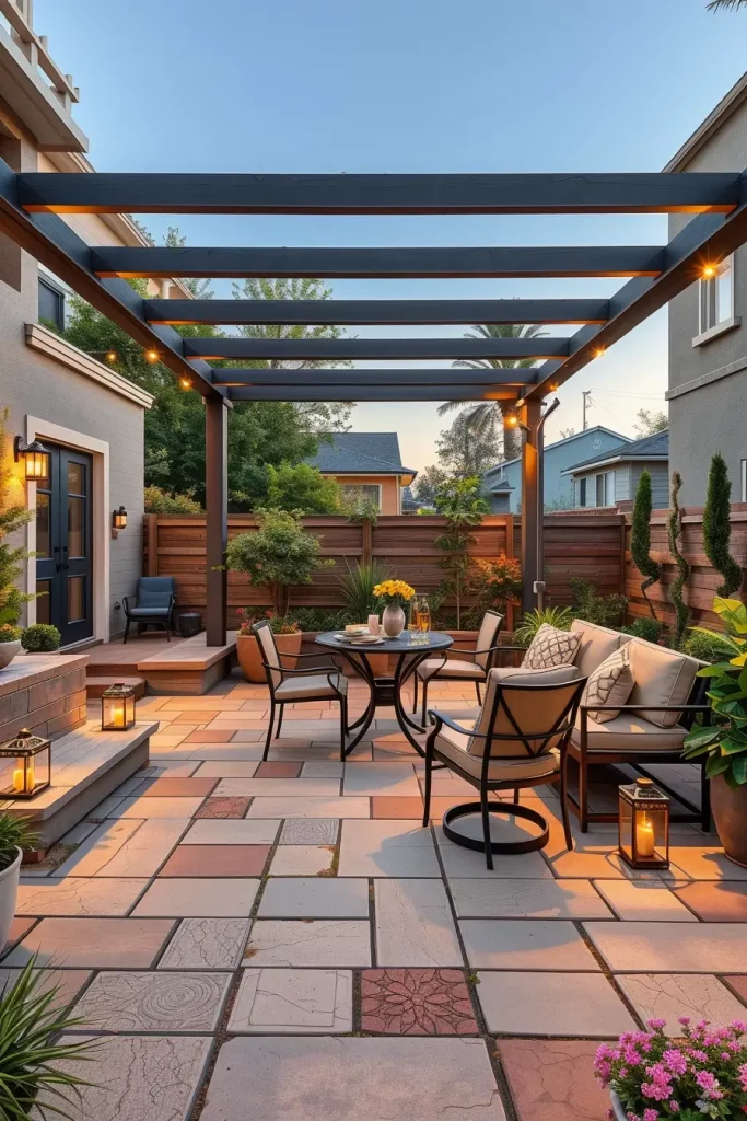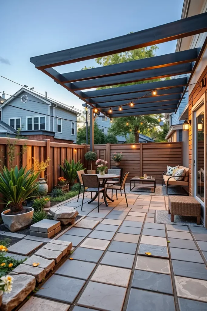 I typically include compact paving materials, a small dining set or lounge seating, and subtle lighting to define the patio zone. Pergolas or partial shade structures help frame the space without enclosing it. The key is balance between structure and openness.