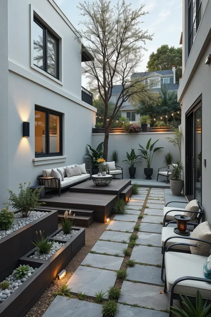 For furniture and surfaces, I recommend recycled composite decking, FSC-certified wood seating, and permeable stone pavers. These materials allow water drainage, prevent overheating, and reduce wear in tight areas. Built-in benches, slim-profile planters, and integrated LED lighting reduce clutter while supporting an organized and modern backyard layout.