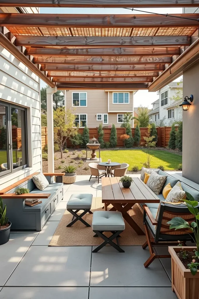 I include foldable tables, storage-integrated seating, and movable planters that adapt to different activities. Wall-mounted shelves, narrow pergolas, and retractable shade solutions are especially effective because they use vertical and overhead space efficiently. These elements ensure that no area feels wasted.