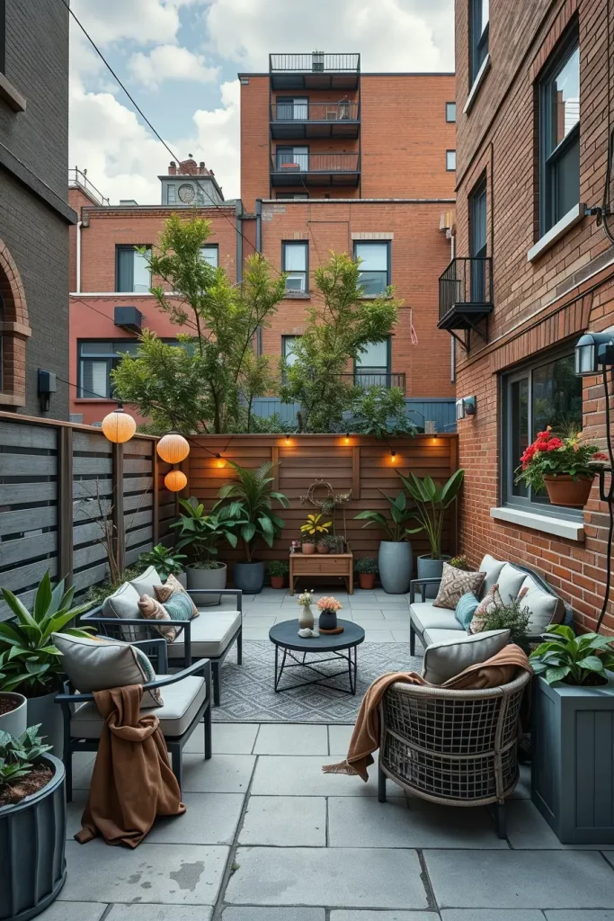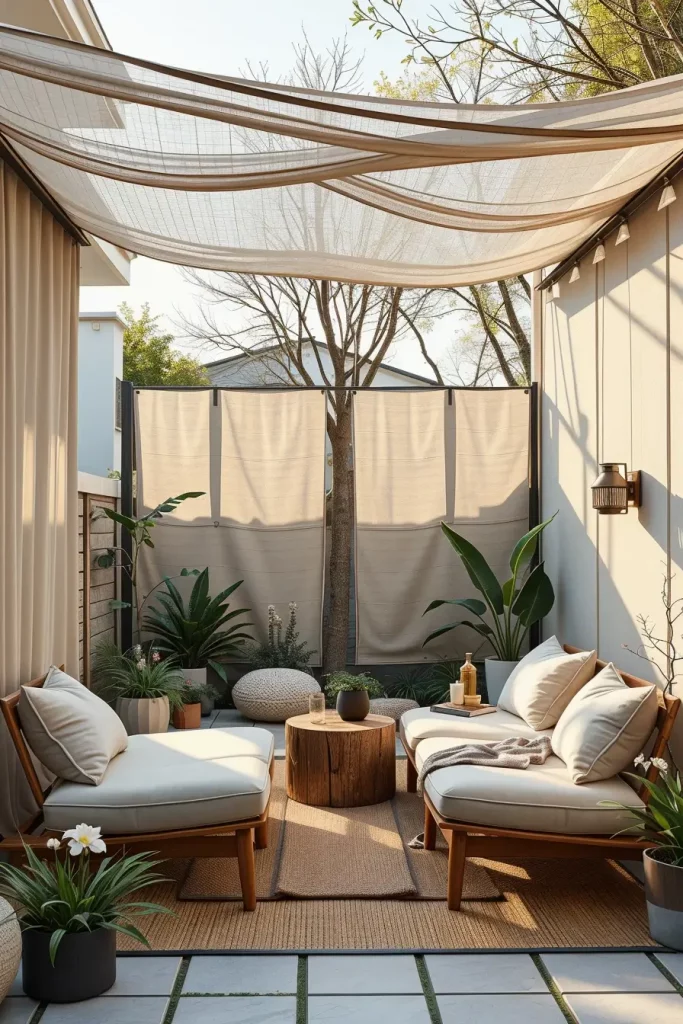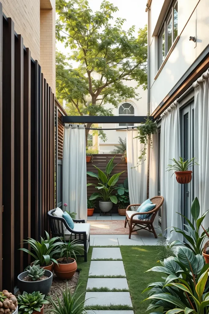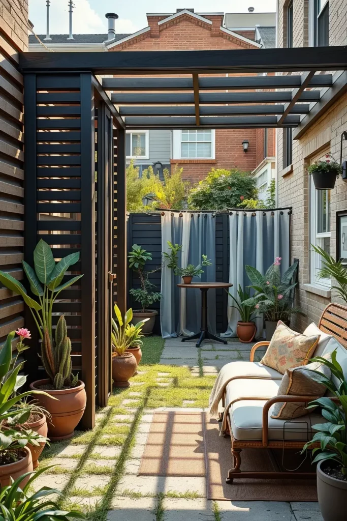 I typically use slatted screens, sheer outdoor curtains, or vertical planters. Slatted designs allow airflow and light while blocking direct sightlines. Curtains add softness and can be adjusted as needed, while vertical greenery offers privacy without adding bulk to the Tiny backyard.