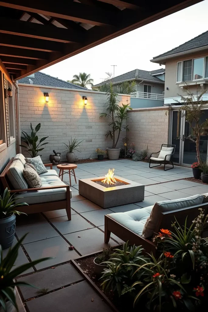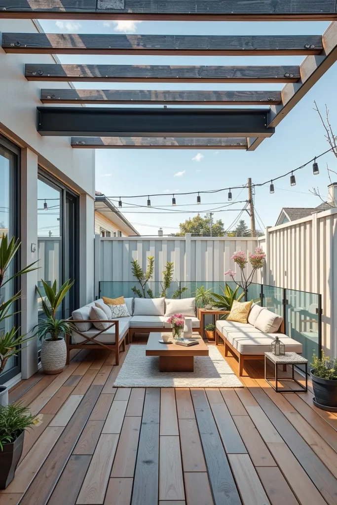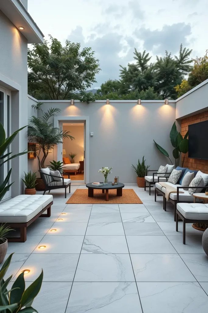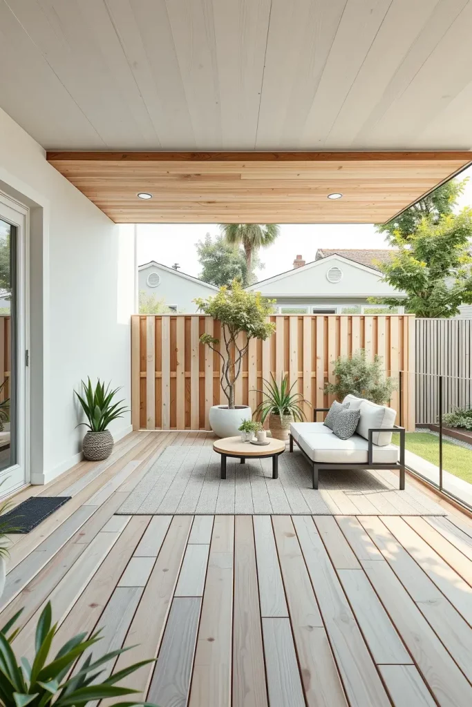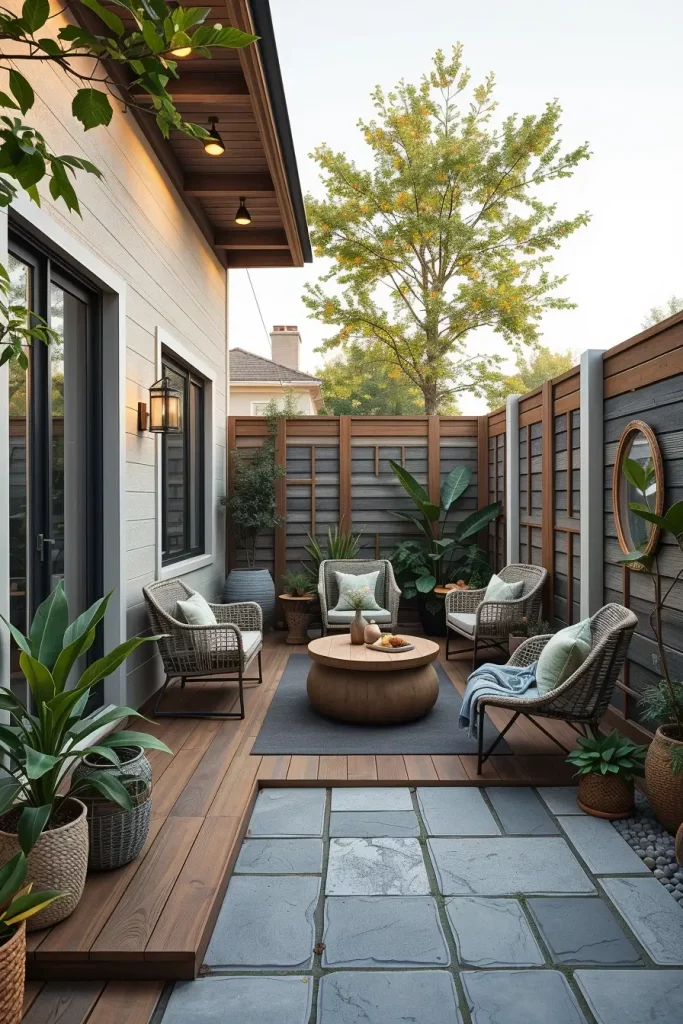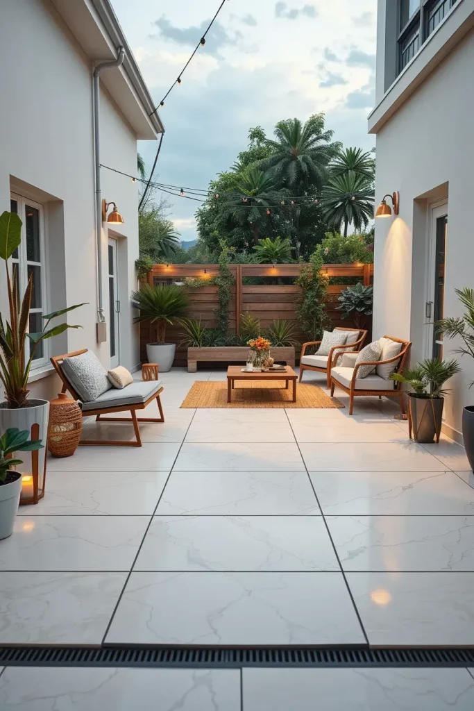 Large-format porcelain tiles, smooth concrete slabs, and narrow composite planks work particularly well in small backyards. I choose slip-resistant finishes with subtle texture to ensure safety without compromising a clean look. Continuous flooring patterns help eliminate visual breaks, making the space feel larger.