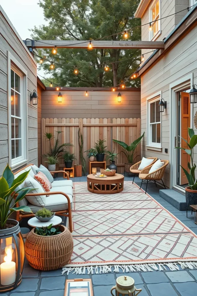 I use outdoor rugs, weather-resistant cushions, and textured throws to soften seating areas. Woven chairs, wood accents, and matte-finish planters add warmth without overwhelming the space. These elements make the backyard feel lived-in and welcoming.