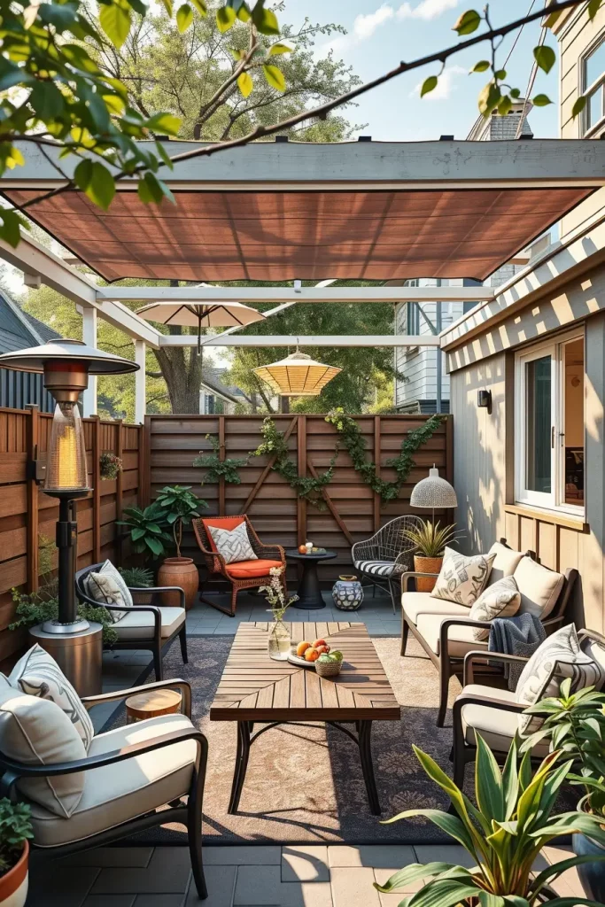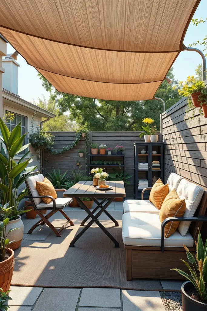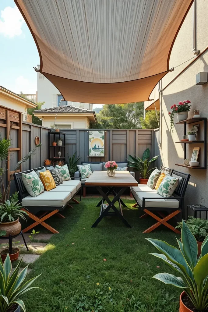 What I would add here is a DIY shade solution such as a fabric sail or adjustable canopy. It enhances comfort and style while remaining affordable for a tiny backyard makeover.