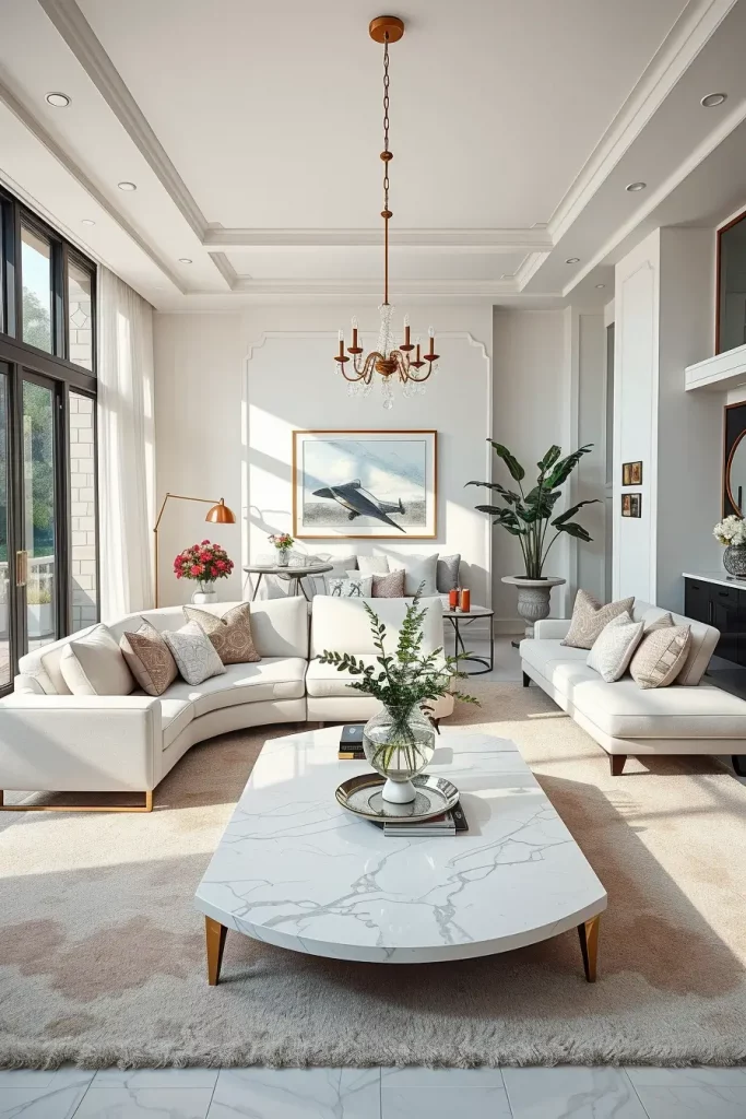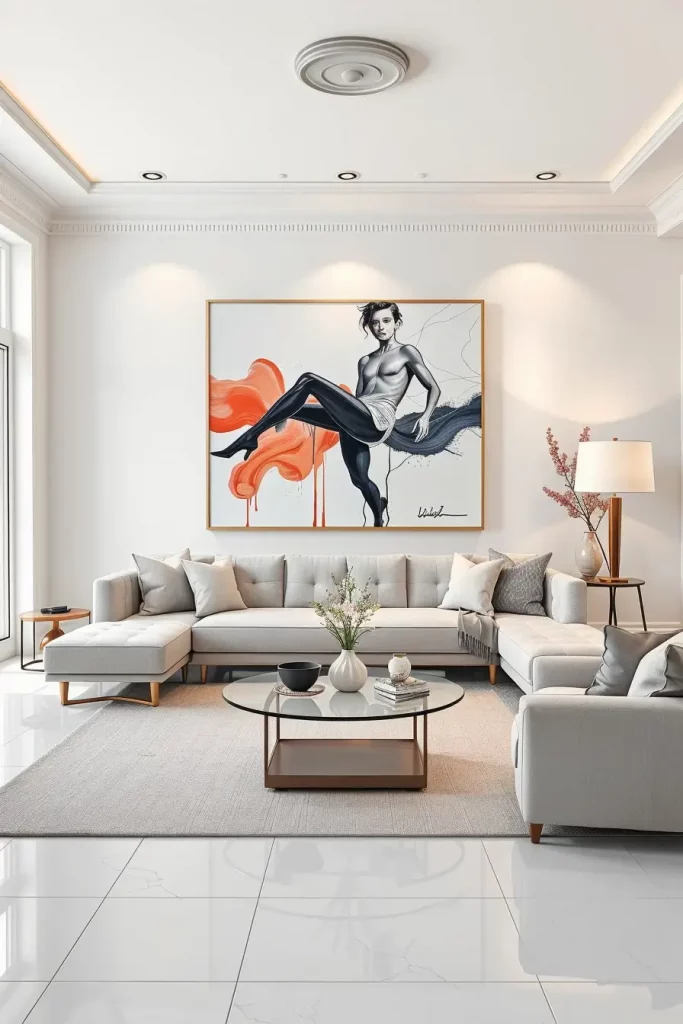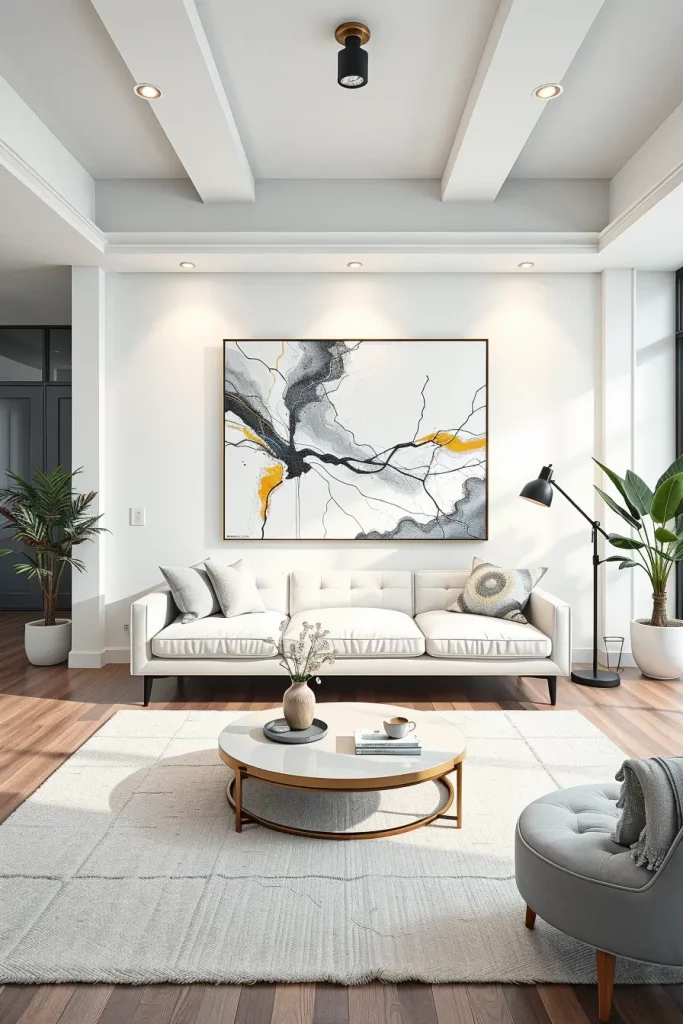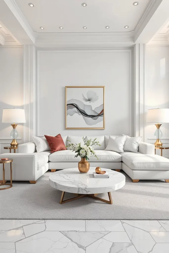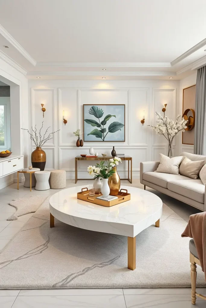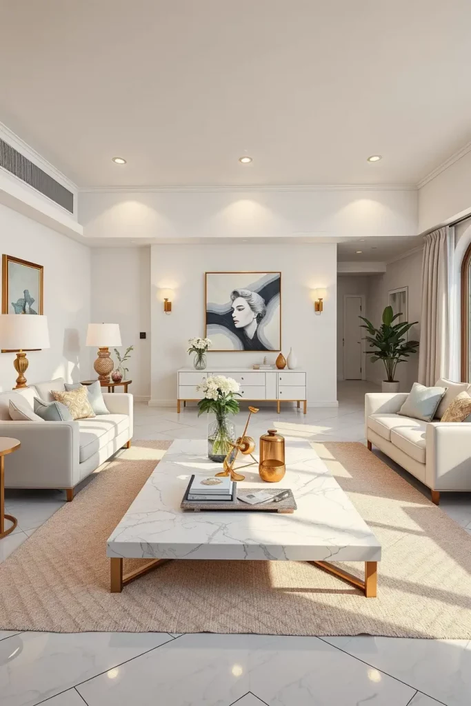 Furniture is at the centre stage. I prefer smooth white couches, marble coffee tables and minimal metallic decoration like brushed steel or brass lamps. Neutral wall art in neutral frames, as well as layered lighting sources such as floor lamps and sconces, make the room appear professional without being too cold.