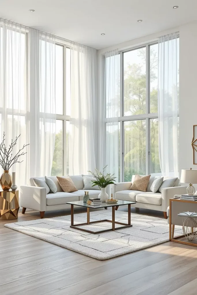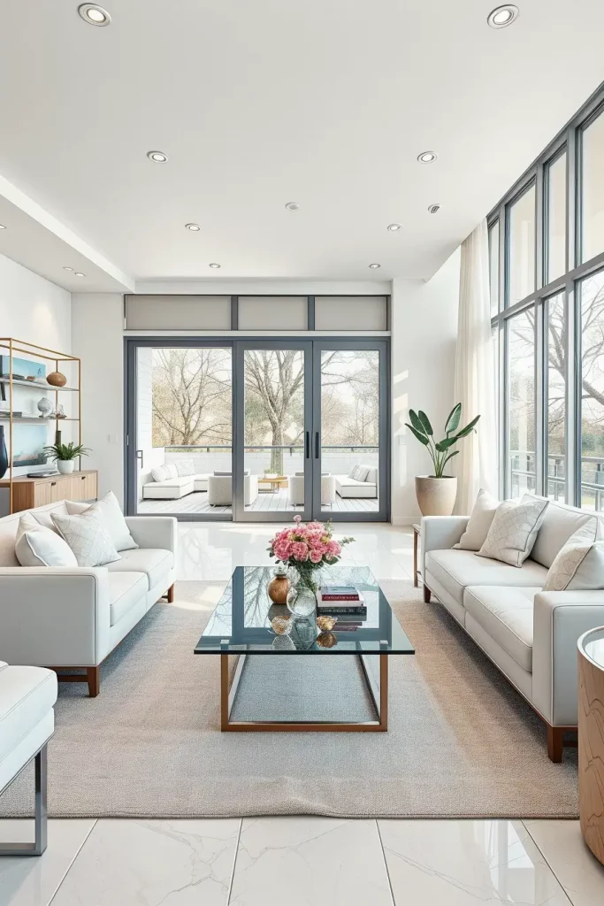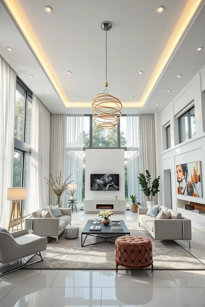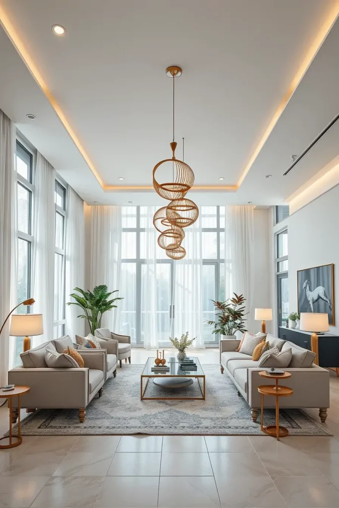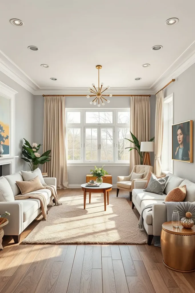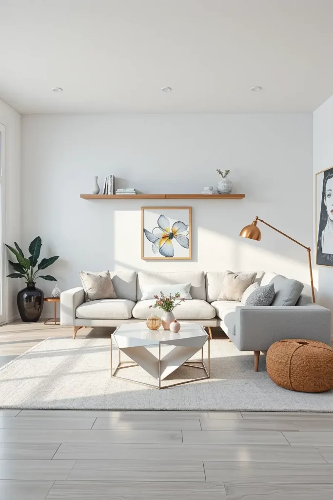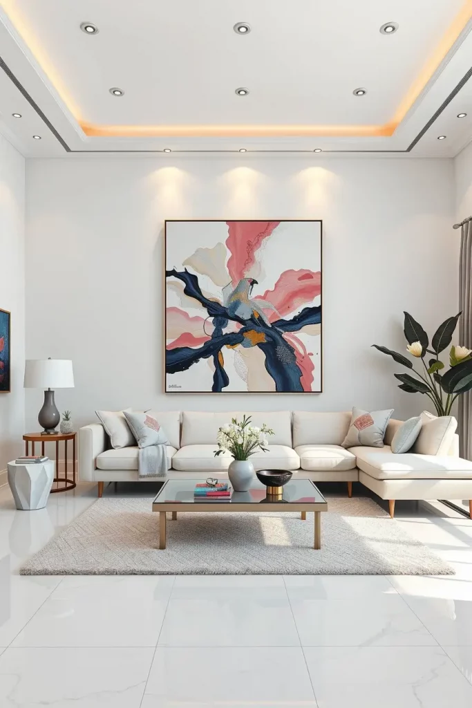 Furniture is at the centre stage. I prefer smooth white couches, marble coffee tables and minimal metallic decoration like brushed steel or brass lamps. Neutral wall art in neutral frames, as well as layered lighting sources such as floor lamps and sconces, make the room appear professional without being too cold.