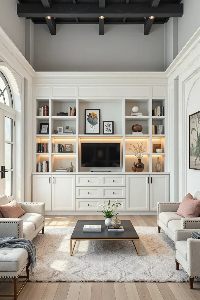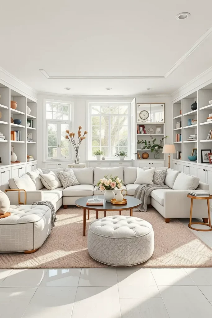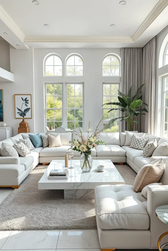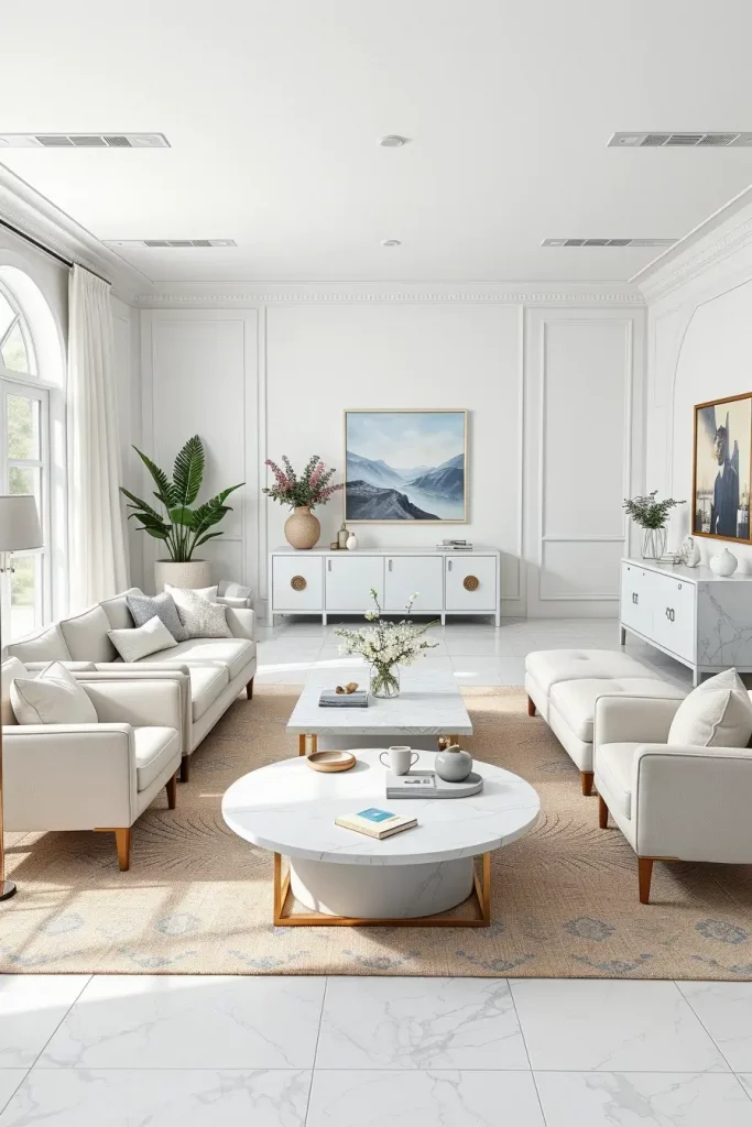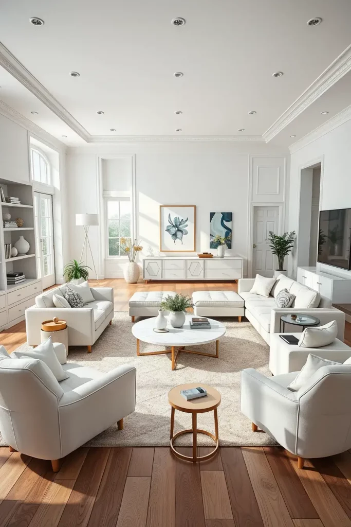I would begin with a big sectional sofa, and add white armchairs or ottomans. White lacquer or marble coffee tables are also used to provide sophistication with shelving units or TV stands in matte white providing visual unity. Even the accent furniture, such as a white sideboard, is used to connect the design.