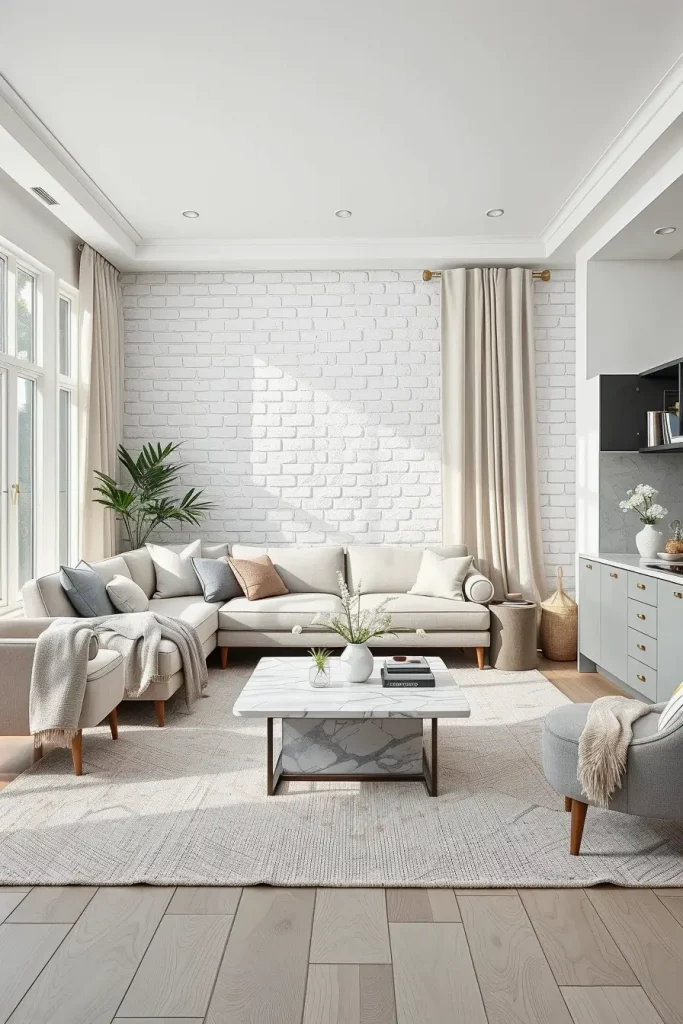 I would add boucle sofas, feature walls made of white brick, wool carpets, and linen curtains. There is variety in a coffee table with marble top and matte white cabinetry and the decorative cushions in soft textures are comfortable. A combination of matte and glossy finishes, e.g. polished white tiles and matte walls, provides depth in layers.