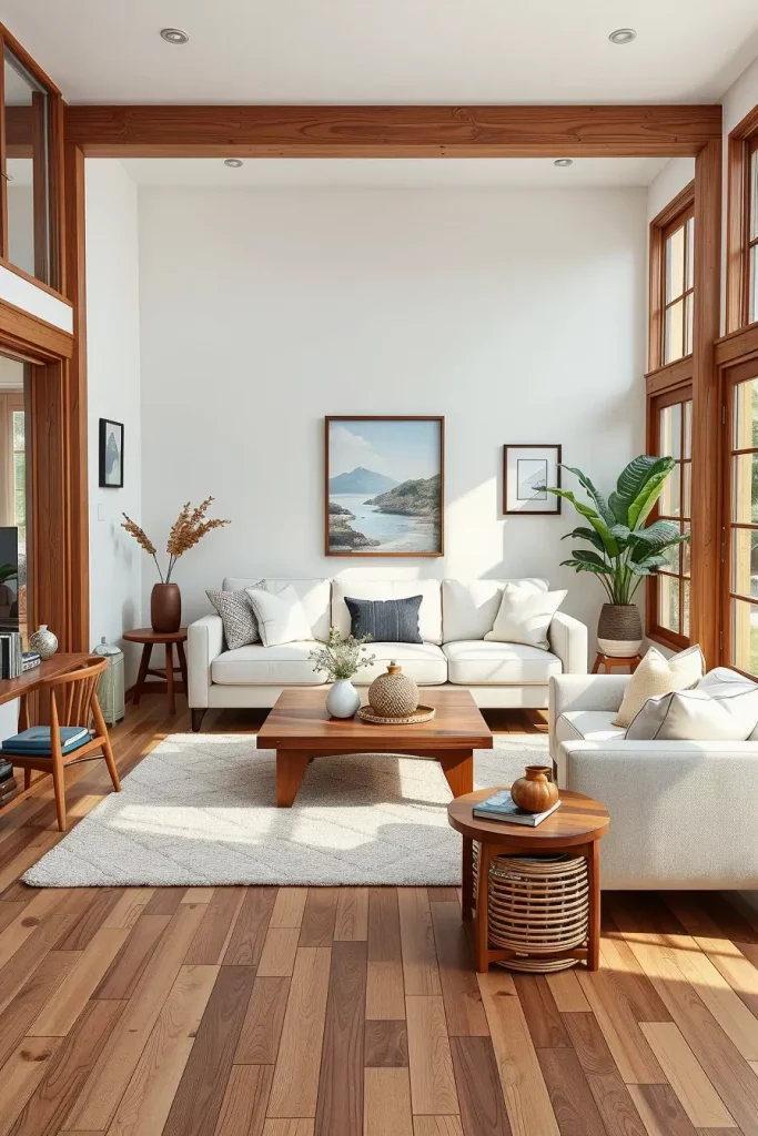 In the case of furniture, I suggest combining a white sofa with a wooden coffee table, sideboard or shelving unit. The natural grain of the wood is emphasized by hardwood floors and white walls. Even minor details, such as wooden picture frames or a statement wooden armchair, can change the atmosphere of the room to the cozy sophistication.