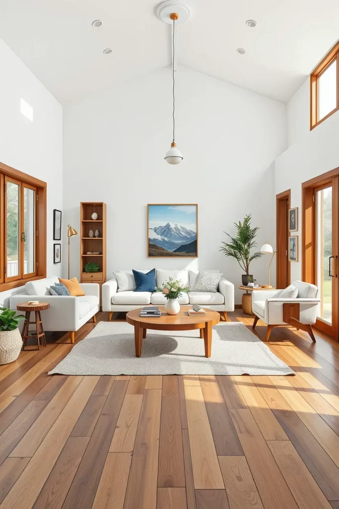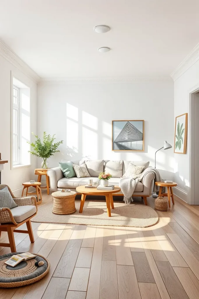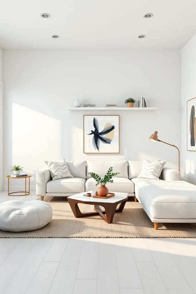 The Scandinavian style of a white living room is focused on simplicity, coziness, and natural harmony. I start with a blank slate; white walls, light wood floors and sleek furniture. The idea is to make the place calm and clutter free that is functional and inviting.