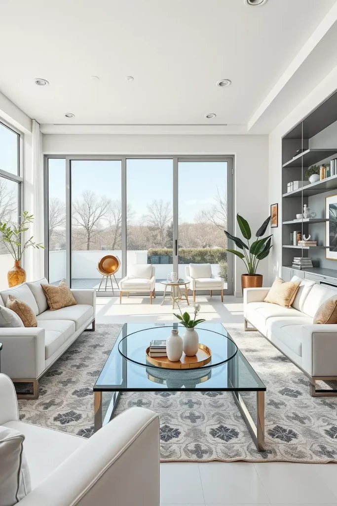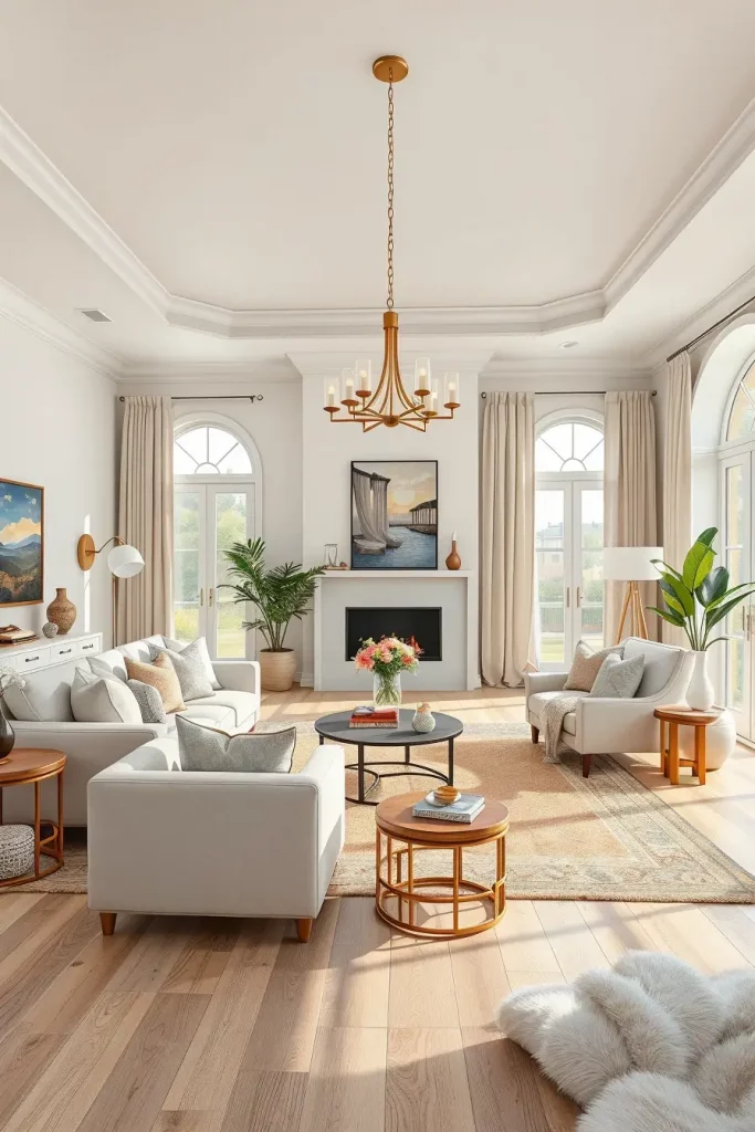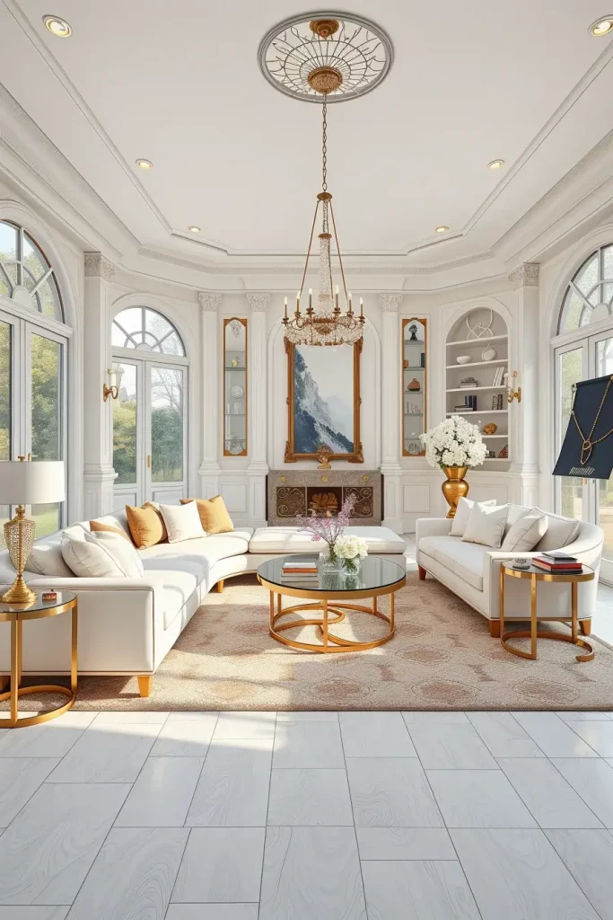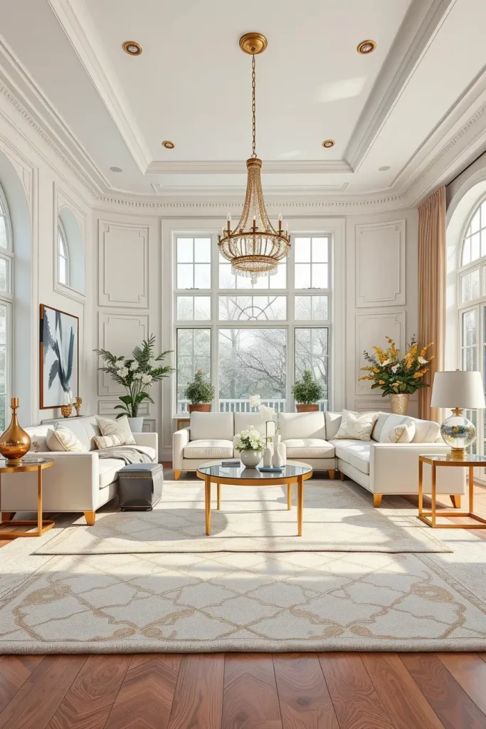 Gold accents are the best thing to add sophistication to a white living room. I tend to add golden frames, metallic side tables or light fixtures with brushed brass accents to add a warm touch to a white room. The metallic property of gold reflects the natural light and gives a depth of richness without overpowering the design.