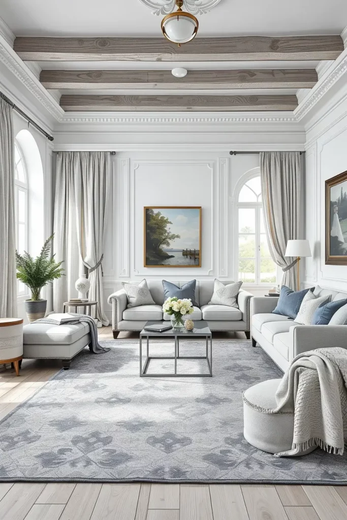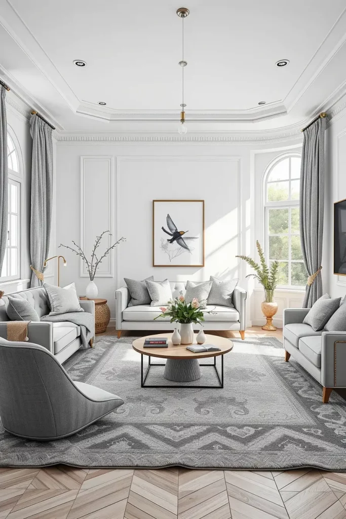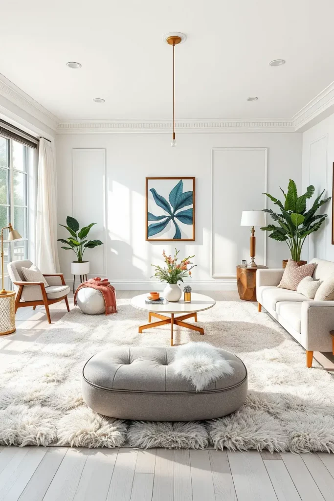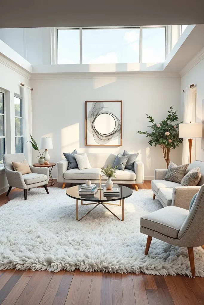 I tend to use soft plush white carpets, shaggy carpets or patterned carpets with light off-white patterns. The presence of a large rug under the couch and coffee table also helps to harmonize the design, whereas smaller accent rugs around seats or reading spots provide an extra dose of comfort. To be luxurious, I occasionally apply high-pile carpets in geometric designs in neutral colors.