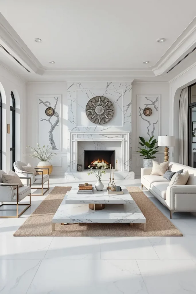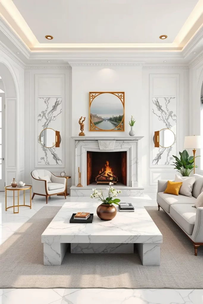 I prefer marble-topped coffee tables, marble-topped console tables, or white marble fireplaces in my designs. Even extensions of kitchen or shelves with marble backgrounds also go well with white interiors. Ornamental items such as marble vases or trays give minor accents that make a difference.