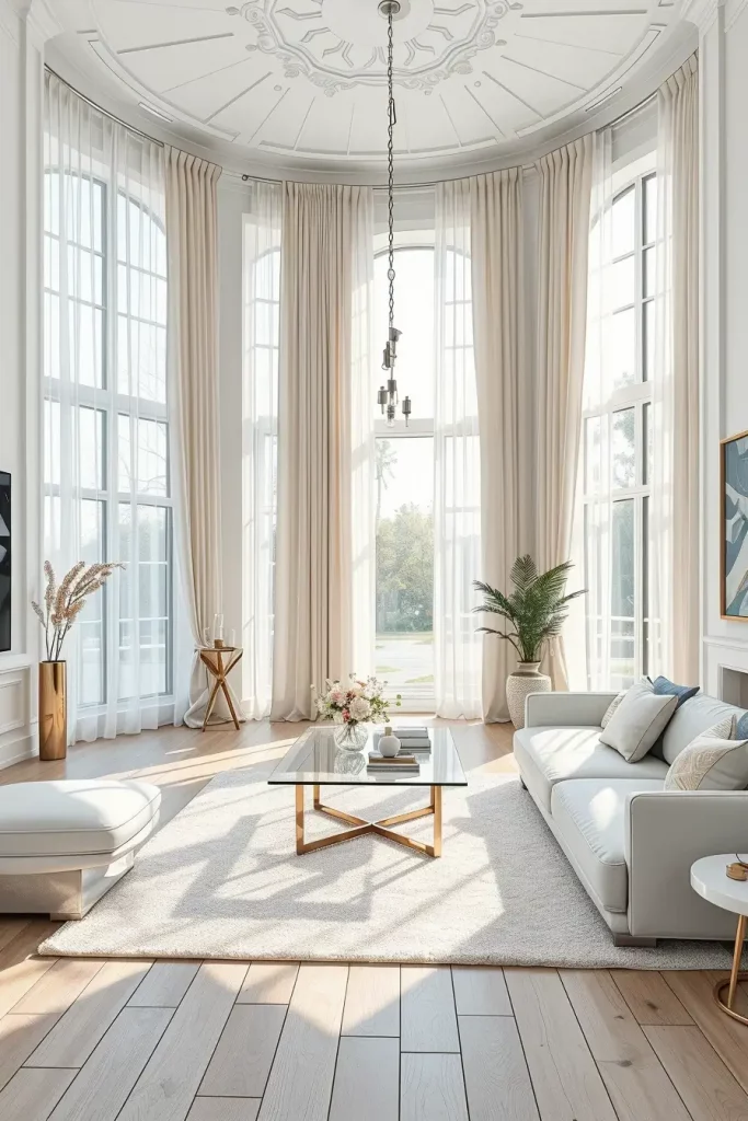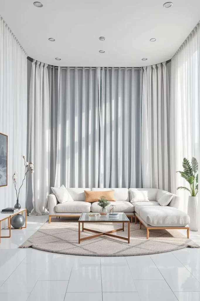 Curtains are usually underestimated, and in a white living room, they are important in softening the room and controlling light. White curtains provide a sense of flow, brightness and frame the windows in a manner that is elegant. The functionality is obvious they provide style and functionality.