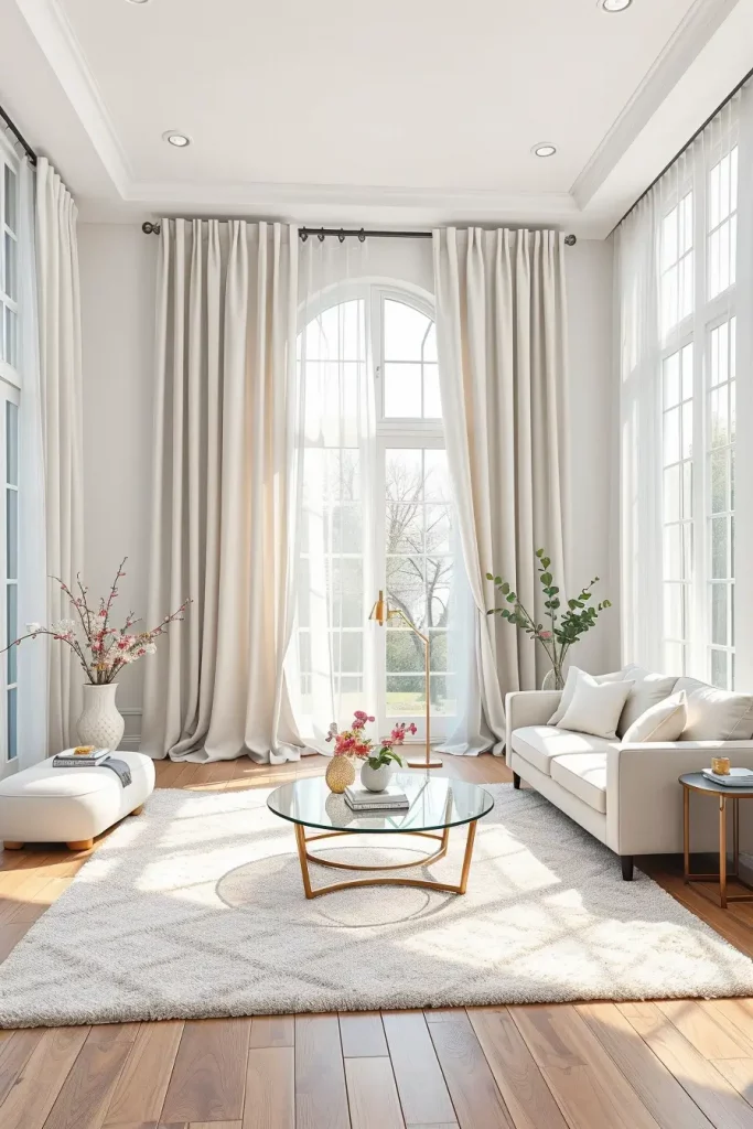 I would suggest light and airy with sheer white curtains or heavier linen curtains that would be more insulating and privacy-giving. Modern living rooms should have floor-to-ceiling drapes, and layered curtains with blinds may provide flexibility. Another design feature is to match them with metallic or wooden curtain rods.