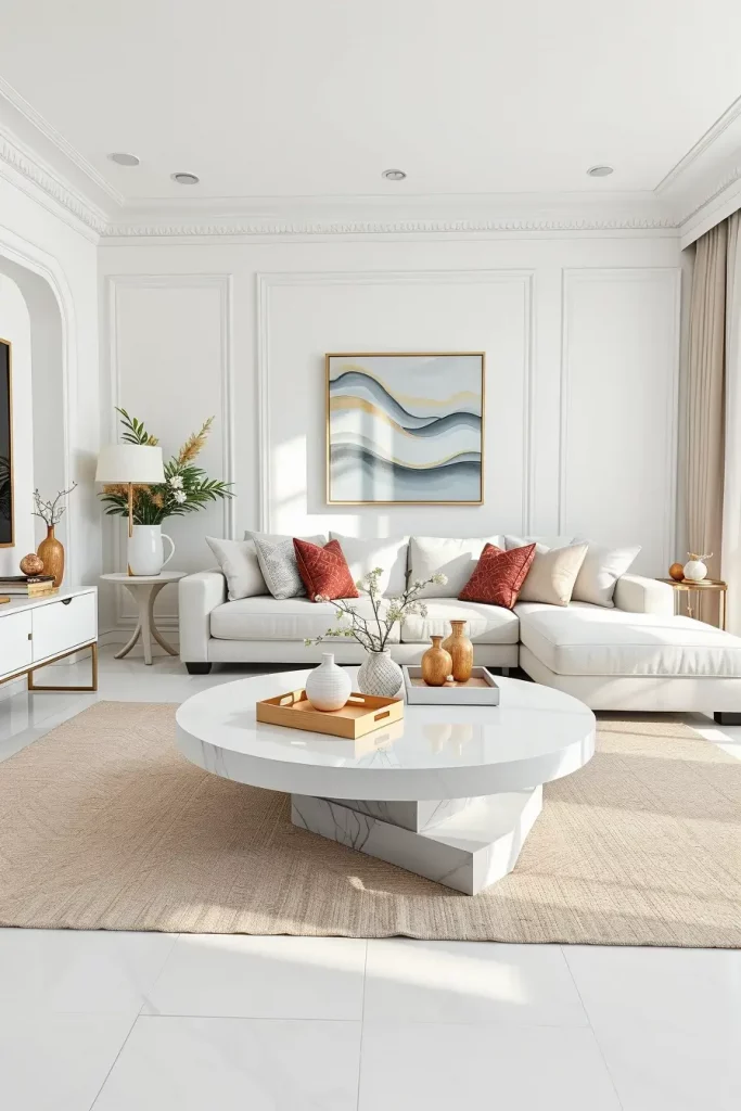 I suggest to invest in a long-lasting white sectional, a contemporary chaise lounge or a curved sofa to make it look softer. Cushions with plain colours or with textured fabrics complement the appearance without dominating the white. In front of the sofa is a marble or glass coffee table that balances and gives sophistication.