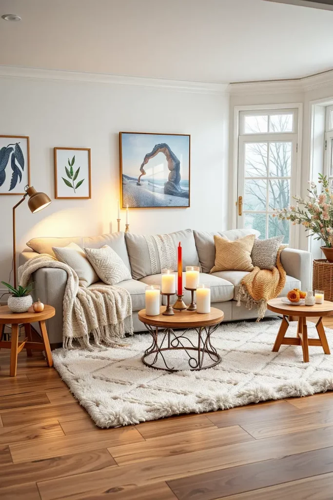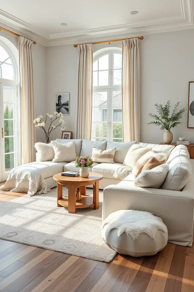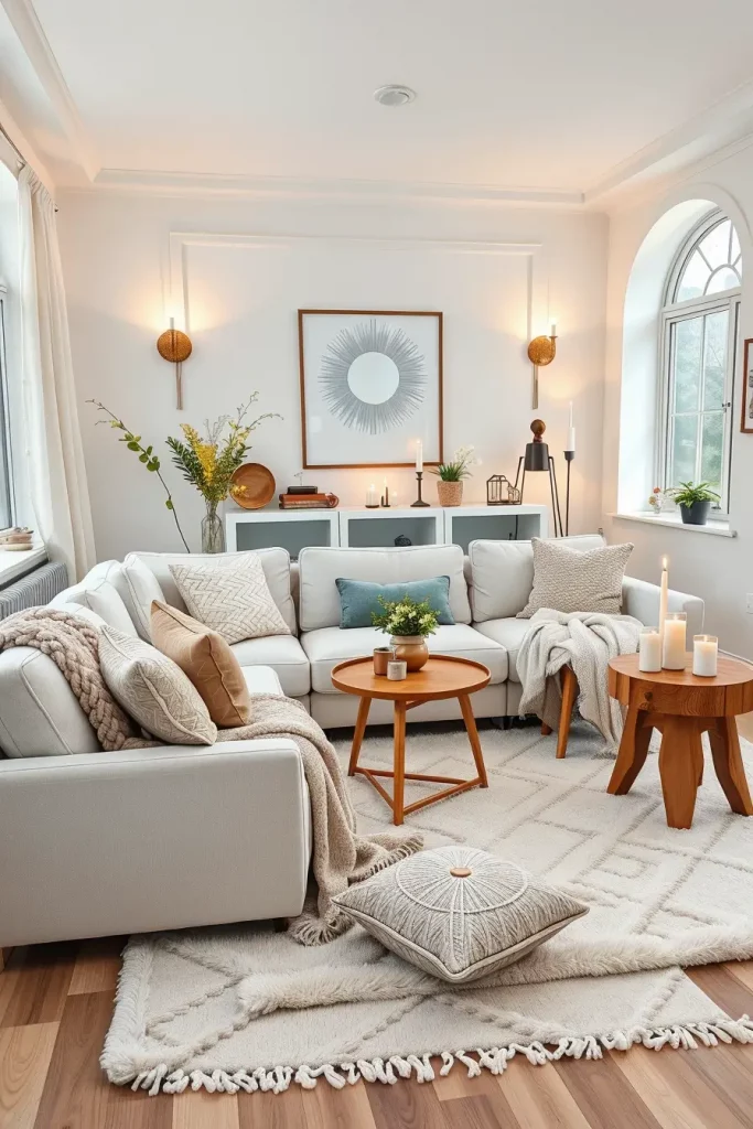 I like combining a plush white sofa and accent chairs in off-white colors, knitted throws, ceramic vases, and wooden side tables. The space is intimate due to candles, lanterns, and warm-colored LED bulbs. Even minor details such as cushions with a texture or fake fur rugs can entirely alter the mood.