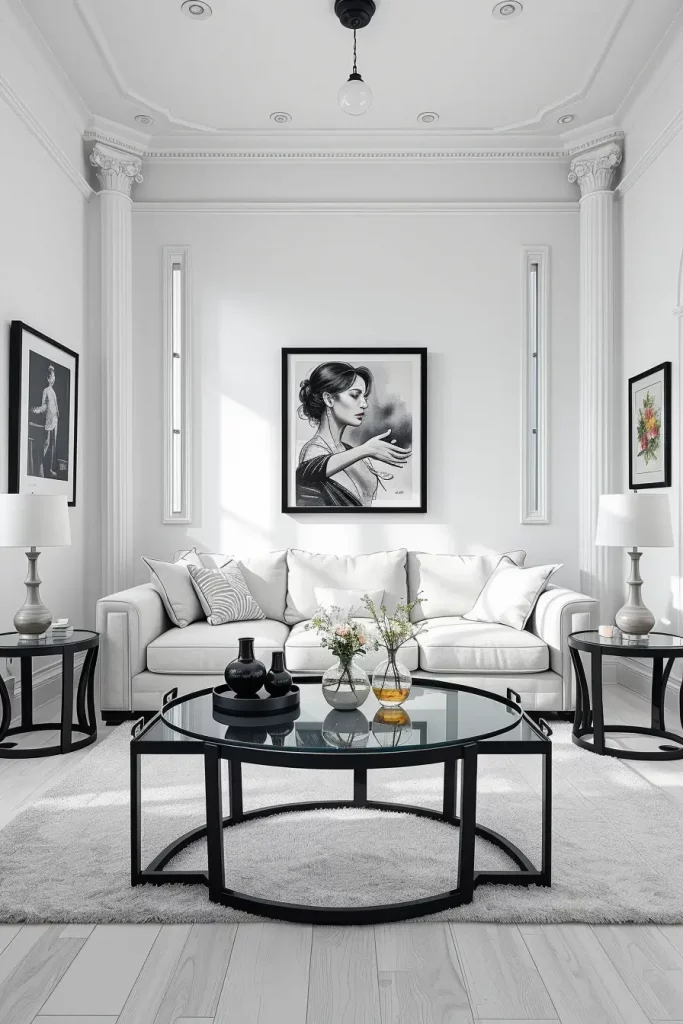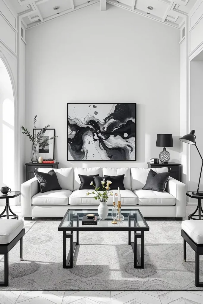 I would suggest the incorporation of black-framed paintings, shelves, or simple lighting devices to strengthen the contrast. Black steel framed glass coffee tables are also effective- they are clear and bold at the same time.