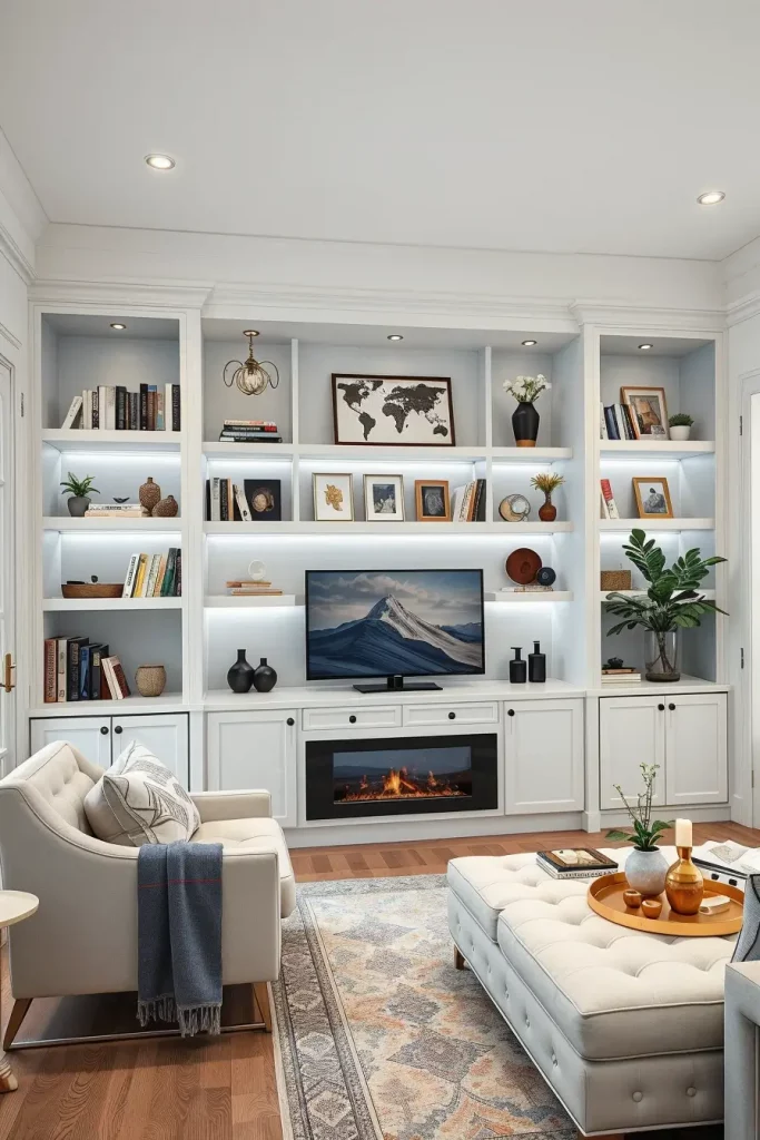 In designing these, I lay emphasis on versatility. There are shelves with books and decor and those that hide storage with hidden cabinets. LED strip lighting under the shelves will emphasize the items and will also provide a warm effect to the overall space.