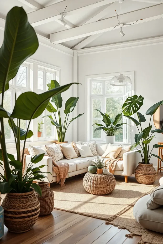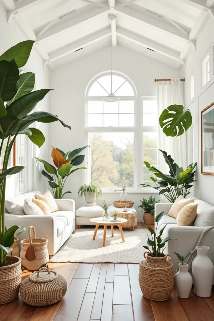 In the case of furniture, I would use soft white sofas, light coffee tables and natural wood accents that would allow the greenery to shine through. Organic feel is supplemented with accessories such as ceramic planters, woven baskets, and glass vases. The juxtaposition of the green vegetation and the white walls brings about an inviting and classic feel.