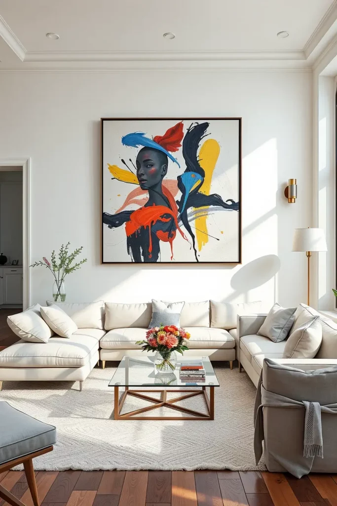 In the case of furniture, I tend to keep it simple to emphasize the art. There are a plain white sofa, a glass coffee table, and sleek shelving that do not distract. Accent lighting on the statement piece makes sure that it is the centre of attention of the room.