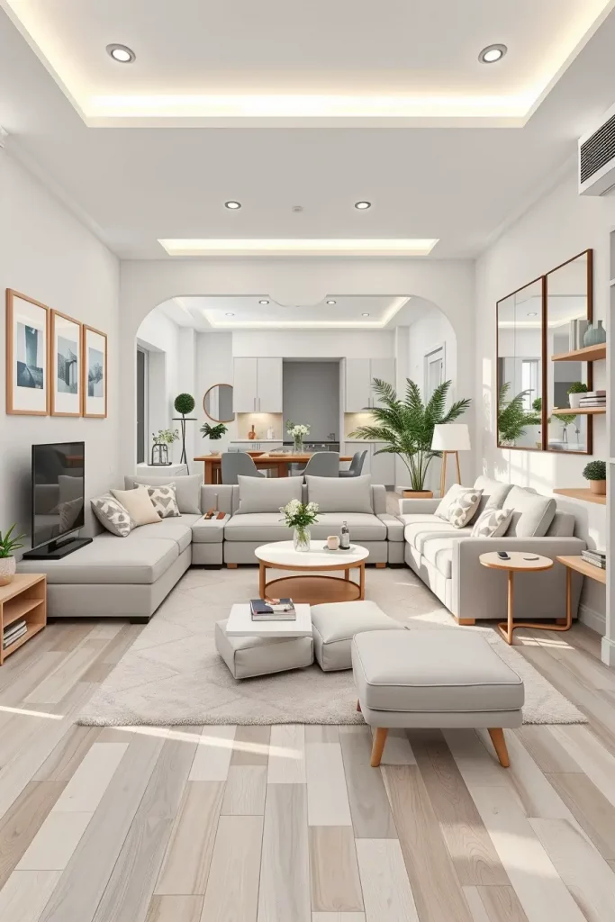 White living rooms in apartments have to be designed smartly to utilize the little space available. I tend to begin with multifunctional items: sofas that store stuff, extendable coffee tables, and modular shelves. White assists in visual expansion of the space, which makes it look more open.