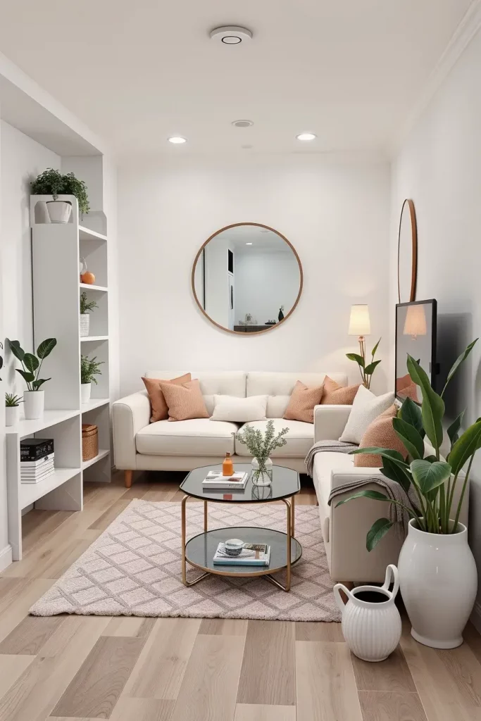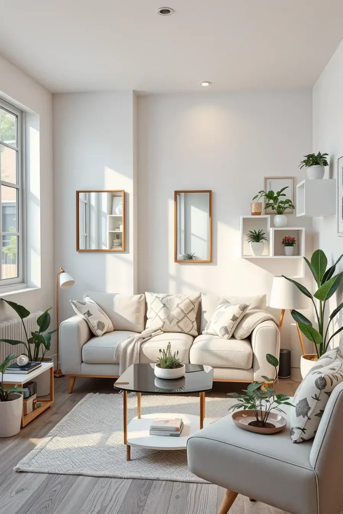 In the case of furniture, I would recommend slender profile white sofas, glass coffee tables, and modular shelves in matte white finishes. The walls have mirrors, particularly with white or silver frames, which increase the light and make the space look bigger. Multi-purpose or folding items such as nesting tables are also maximized.