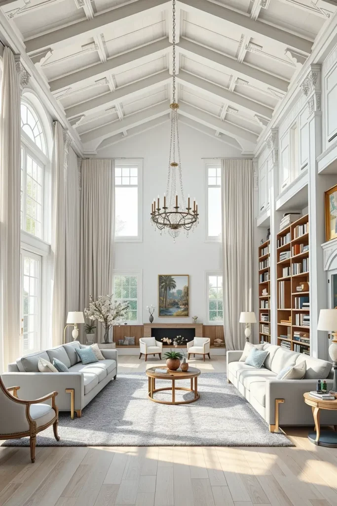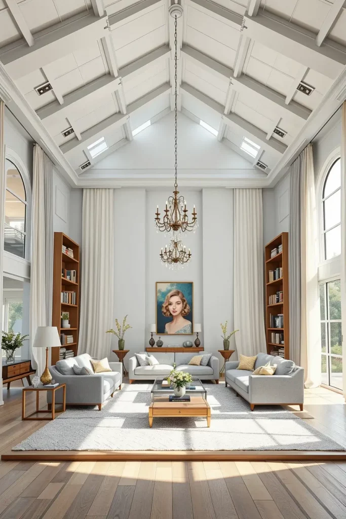 In furniture, I would suggest large white sofas, tall book shelves and fancy coffee tables. Lighting is also important pendants or hanging lamps will attract the eye upwards and enhance the ceiling height.