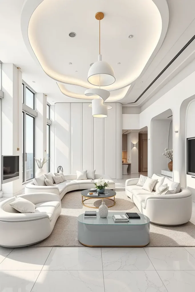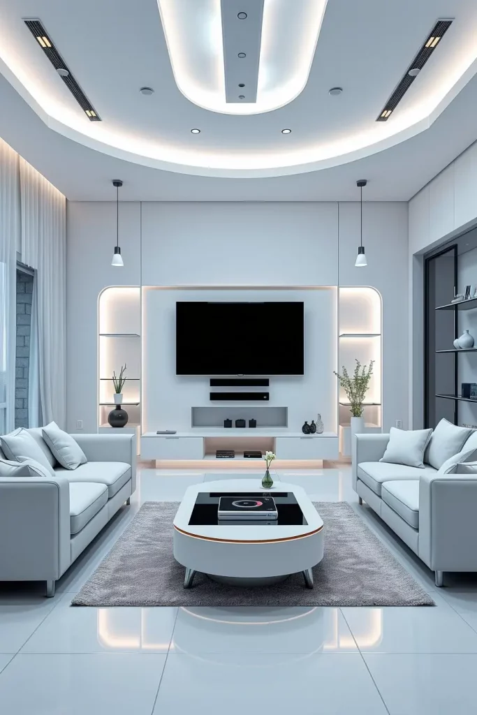 In choosing furniture, I will pick up modular white sofas that have hidden storage and charging points. The low-profile entertainment unit in matte white forms a smooth transition with the wall, which enables a big flat-screen or projection system to be hidden when not in use. There is another layer, smart lighting, e.g., recessed LED strips, which automatically changes according to the time of the day and the mood. Coffee tables are even fitted with wireless charging surfaces and I find this both practical and subtle in a white dominant design.