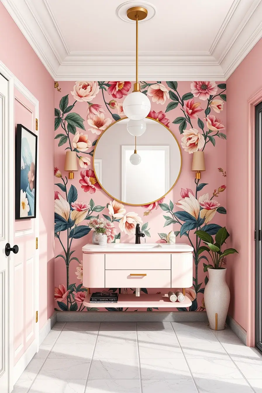 I tend to suggest moisture resistant vinyl wall paper in bathrooms as it can withstand humidity. Combining the bold wallpaper with plain tiles or neutral flooring is the right way to maintain the balance. An accent wall behind the vanity such as a floral one can be the centerpiece to the whole space.