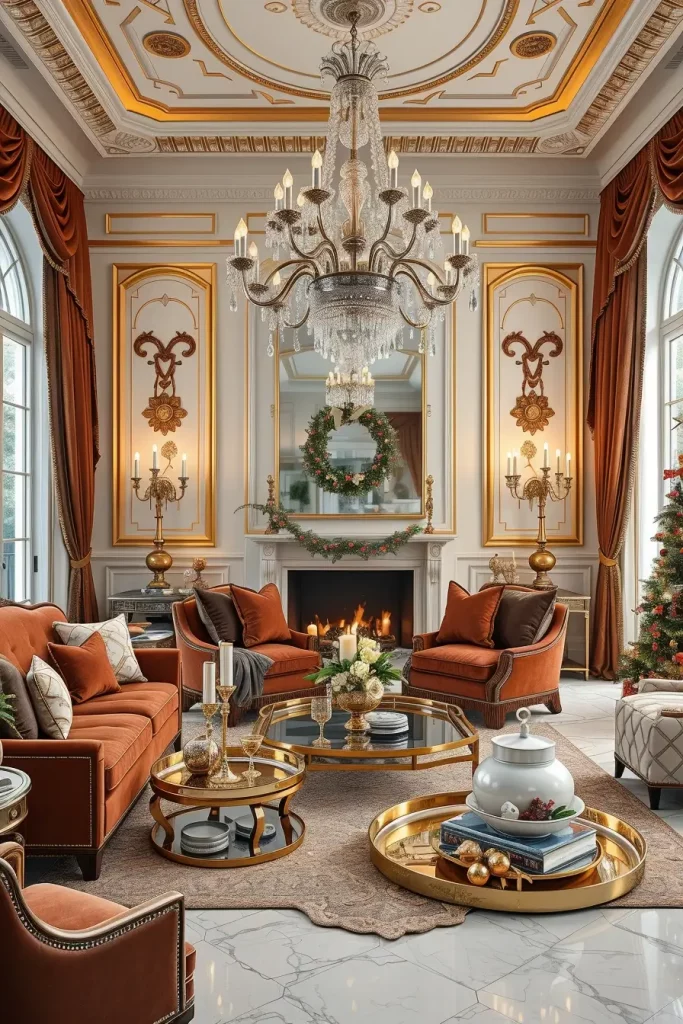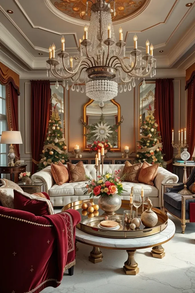 I would suggest some designer-inspired elements, like crystal chandeliers, candles served on metal trays with mirrors and metallic centerpiece bowls with ornaments. Welty cushions, cashmere blankets, and sculptural items of decor contribute to the feeling of decadence. The combination of textures makes it three-dimensional and rich, but not overpowering.