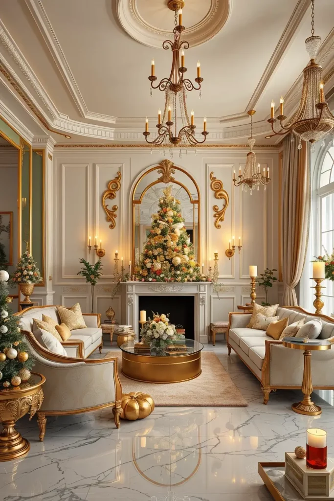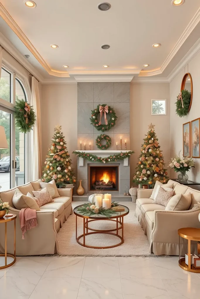 To create the glamorous golden effect, I use metallic wreaths, candle holders, and ornaments in champagne and brushed gold color. I would combine them with cream-colored fabrics, marble-clothed tables, and a eye-catching chandelier to come up with a unified look of luxury. With glowingly glittering ribbons and baubles accented with gold, a Christmas tree makes the omnipotent of the room.