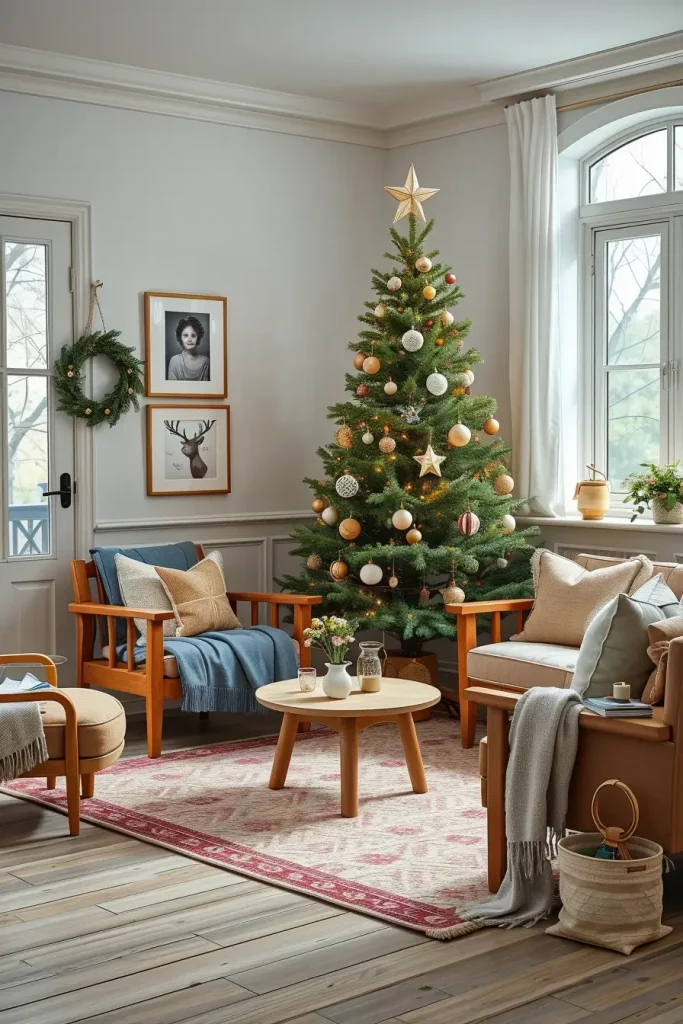 I normally attach a little pine or spruce tree with basic wooden ornaments, paper stars and string lights. Mercenary blankets, knitted throws, and linen cushions will bring a sense of touch. In the case of furniture, I will like pale-colored wood tables, mid-century seats/chairs, and open shelves to highlight the minimalistic, functional style characteristic of Nordic houses.