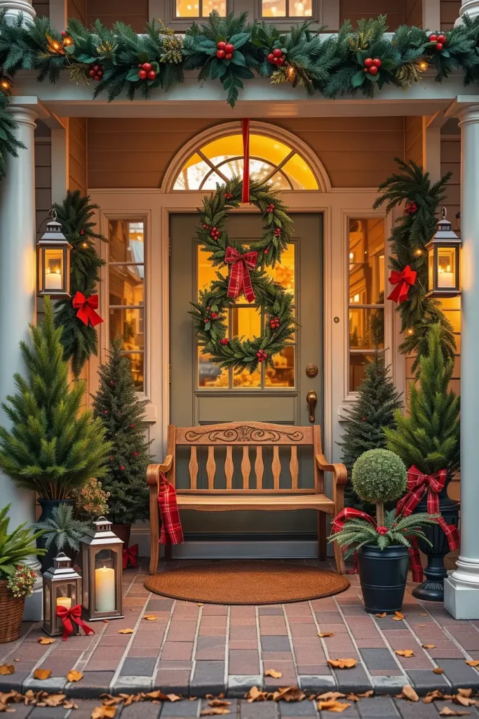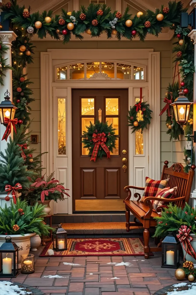 I normally use natural garlands and plaid ribbons and rustic doormats in combination with vintage-style rocking chairs, and benches. Wrapped faux gifts or little decorative sleds are also a nice addition that will add more holiday spirit. Railings and door frame string lights unite the whole porch in an indoor-like design to the outside.