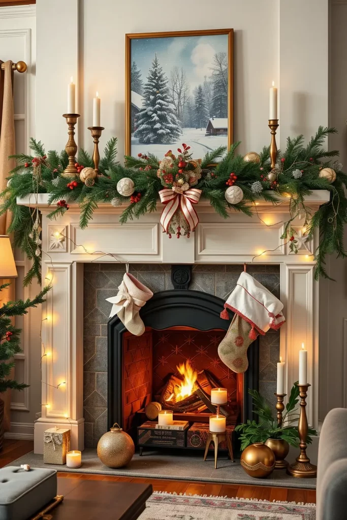 In the dressing of the mantel I like to mix natural decorations such as evergreen branches, pinecones, and wooden decorations with metal ornaments to provide contrast. The trend of a contemporary Christmas scene is the use of brass candlesticks, fairy lights, and multi-layered garlands in various textures. Linen or velvet stockings are also worn and a statement mirror or a framed winter work above the mantel will also finish the luxurious appearance.